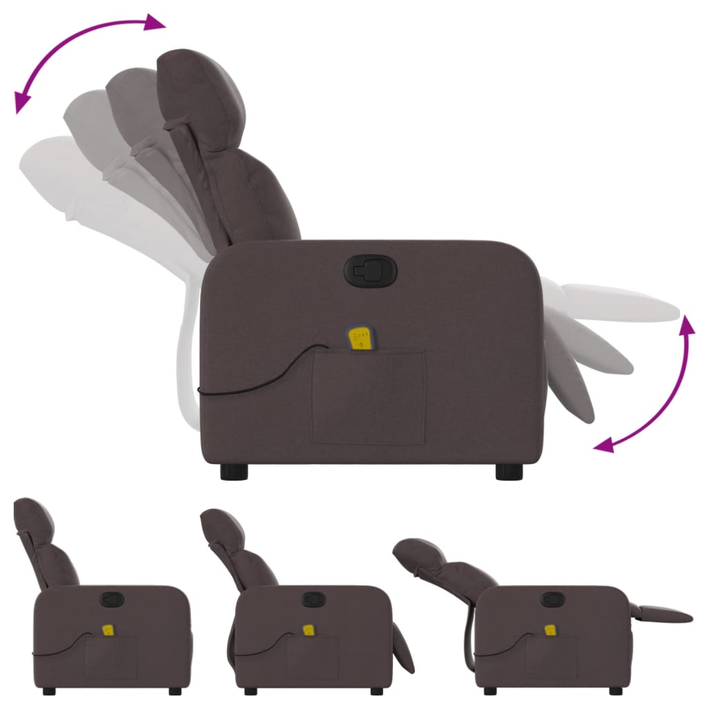 Sente-se e relaxe nesta poltrona de massagens reclinável altamente confortável! Função de reclinação manual: esta poltrona reclinável possui uma pega no lado direito. Pode ajustar manualmente o encosto e o apoio de pés em qualquer posição, de acordo com as suas necessidades de conforto, ao puxar a pega. Este recurso permite uma inclinação máxima de 135 graus. Além disso, o encosto pode voltar para a posição original rápida e facilmente se puxar a pega.Função de vibração: os 6 pontos de massagem incluídos permitem que experiencie uma massagem mais bem orientada. O controlo manual incluído permite-lhe ainda escolher diferentes programas de massagem. A função de massagens é alimentada pelo conector USB, mas a fonte de alimentação USB certificada de 5V não está incluída.Experiência de assento confortável: o assento e encosto espessamente acolchoados e os apoios de braços largos cobertos de tecido proporcionam uma sensação quente e aconchegante, fazendo-o sentir-se abraçado enquanto está sentado. O tecido apresenta um aspeto simples e liso, sendo também respirável e durável.Bolso lateral conveniente: esta poltrona possui um bolso lateral para o seu controlo remoto ou para manter os seus artigos essenciais ao alcance.Estrutura sólida e estável: a estrutura feita de madeira e metal proporciona uma estrutura forte e estável. Esta poltrona reclinável é confortável e durável. Ter em atenção o risco de fogos abertos e outras fontes de calor forte nas proximidades do produto. Máximo de 110 kg por assento. Este produto é alimentado por CC 5V, mas a fonte de alimentação USB de 5V certificada não está incluída. Uma tensão mais elevada pode provocar um sobreaquecimento e resultar em danos no dispositivo e no risco potencial de sobreaquecimento e incêndio.