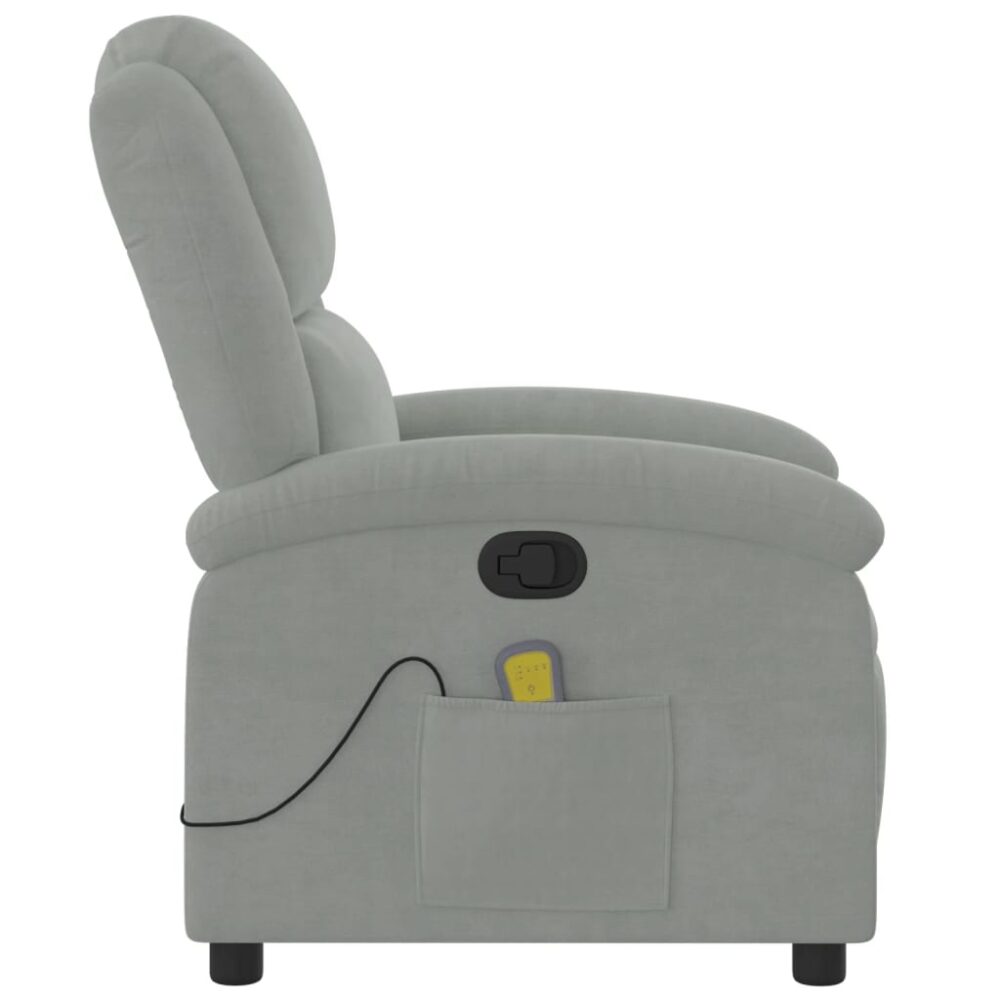 Sente-se e relaxe nesta poltrona de massagens reclinável altamente confortável! Função de reclinação manual: esta poltrona reclinável possui uma pega no lado direito. Pode ajustar manualmente o encosto e o apoio de pés em qualquer posição, de acordo com as suas necessidades de conforto, ao puxar a pega. Este recurso permite uma inclinação máxima de 135 graus. Além disso, o encosto pode voltar para a posição original rápida e facilmente se puxar a pega.Função de vibração: os 6 pontos de massagem incluídos permitem que experiencie uma massagem mais bem orientada. O controlo manual incluído permite-lhe ainda escolher diferentes programas de massagem. A função de massagens é alimentada pelo conector USB, mas a fonte de alimentação USB certificada de 5V não está incluída.Experiência de assento confortável: o assento e encosto espessamente acolchoados e os apoios de braços largos cobertos de veludo proporcionam uma sensação quente e aconchegante, fazendo-o sentir-se abraçado enquanto está sentado. O veludo é um tecido macio e confortável que proporciona uma boa sensação em contacto com a pele.Bolso lateral conveniente: esta poltrona possui um bolso lateral para o seu controlo remoto ou para manter os seus artigos essenciais ao alcance.Estrutura sólida e estável: a estrutura feita de madeira e metal proporciona uma estrutura forte e estável. Esta poltrona reclinável é confortável e durável.