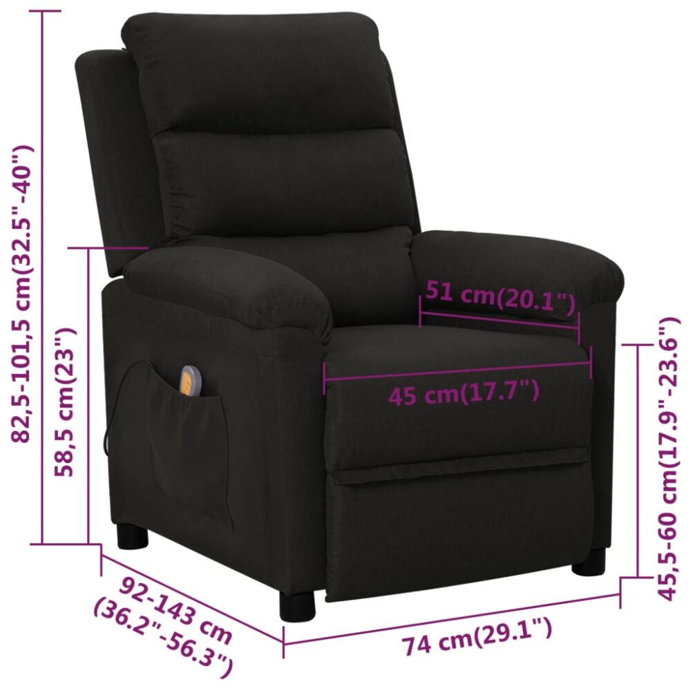 Sente-se e relaxe nesta poltrona de massagens altamente confortável! Função reclinável manual: a poltrona reclinável foi especialmente concebida com 3 posições de reclinação para que possa ajustar o encosto e o apoio para os pés manualmente, de acordo com as suas necessidades de conforto.Função de vibração: os 6 pontos de massagem incluídos permitem que experiencie uma massagem mais bem orientada. O controlo manual incluído permite-lhe ainda escolher diferentes programas de massagem. A função de massagens é alimentada pelo conector USB, mas a fonte de alimentação USB certificada de 5V não está incluída.Experiência de assento confortável: o assento e encosto espessamente acolchoados e os apoios de braços largos cobertos de tecido proporcionam uma sensação quente e aconchegante, fazendo-o sentir-se abraçado enquanto está sentado. O tecido apresenta um aspeto simples e liso, sendo também respirável e durável.Estrutura sólida e estável: a estrutura de madeira e metal proporciona uma estrutura forte e estável. Esta poltrona reclinável é confortável e durável.