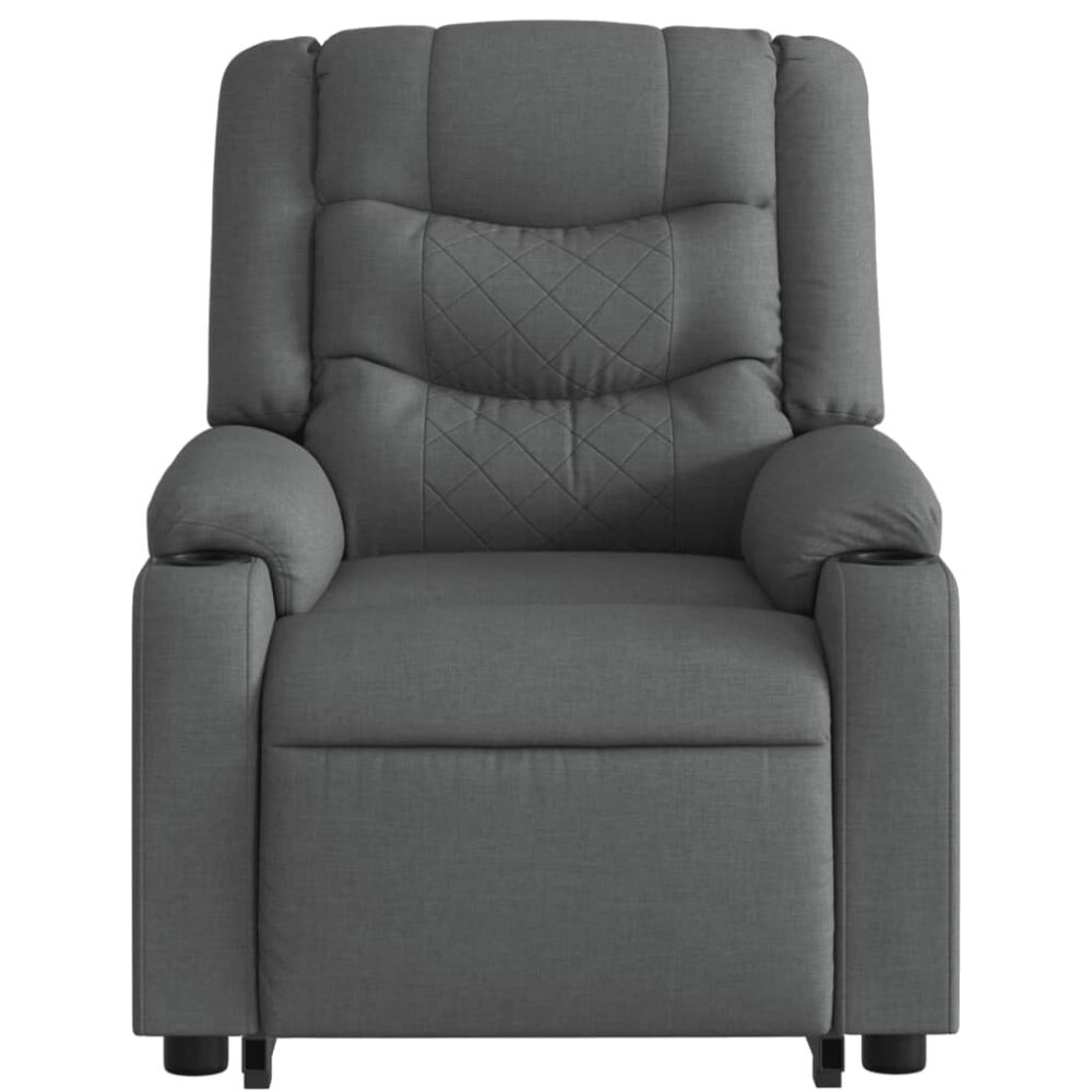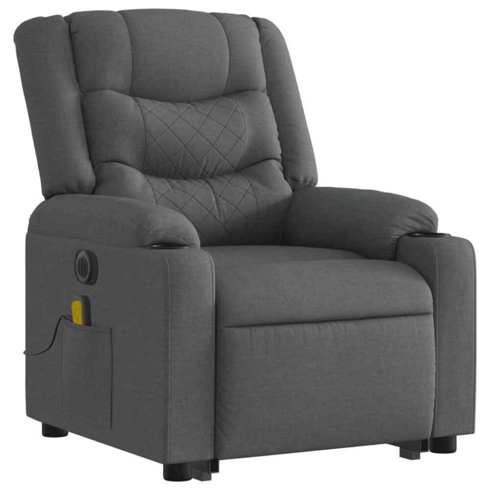 Sente-se e relaxe nesta poltrona reclinável, elevatória e elétrica de massagens altamente confortável! Função elevatória: a poltrona reclinável para idosos está equipada com um motor elétrico para a função de elevação. Graças à função que empurra toda a poltrona para cima, pode facilmente levantar-se sem criar desconforto às suas costas e joelhos com o simples premir de um botão.Função de reclinação elétrica: esta poltrona reclinável está também equipada com um motor elétrico que permite ajustar automaticamente o encosto e o apoio de pés para qualquer posição, de acordo com as suas necessidades de conforto, com um simples toque no botão existente na parte lateral. Este recurso permite uma inclinação máxima de 135 graus. Além disso, o encosto pode voltar para a posição original rápida e facilmente se premir o botão.Função de vibração: os 6 pontos de massagem permitem que experiencie uma massagem mais bem orientada. O controlo manual incluído permite-lhe ainda escolher diferentes programas de massagem. A função de massagens é alimentada pelo conector USB que exige uma fonte de alimentação USB certificada de 5V (não incluída).Experiência de assento confortável: o assento e encosto espessamente acolchoados e os apoios de braços largos cobertos de tecido proporcionam uma sensação quente e aconchegante, fazendo-o sentir-se abraçado enquanto está sentado. O tecido apresenta um aspeto simples e liso, sendo também respirável e durável.Bolso lateral conveniente: esta poltrona possui um bolso lateral para o seu controlo remoto ou para manter os seus artigos essenciais ao alcance.Estrutura sólida e estável: a estrutura feita de madeira e metal proporciona uma estrutura forte e estável. Esta poltrona reclinável é confortável e durável. Esteja ciente do risco de fogos abertos e outras fontes de calor forte nas proximidades do produto. Máximo de 110 kg por assento. Este aparelho pode ser utilizado por crianças a partir dos 8 anos de idade e por pessoas com capacidades físicas, sensoriais ou mentais reduzidas, ou com falta de experiência e conhecimentos, desde que tenham recebido supervisão ou instruções relativas à utilização do aparelho de forma segura e compreendam os perigos envolvidos. As crianças não devem brincar com o aparelho. A limpeza e a manutenção a serem efetuadas pelo utilizador não devem ser levadas a cabo por crianças sem supervisão.
