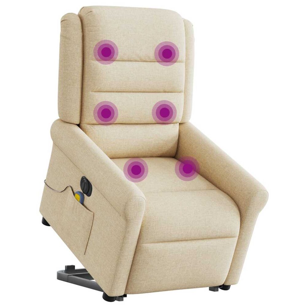Sente-se e relaxe nesta poltrona reclinável, elevatória e elétrica de massagens altamente confortável! Função elevatória: a poltrona reclinável para idosos está equipada com um motor elétrico para a função de elevação. Graças à função que empurra toda a poltrona para cima, pode facilmente levantar-se sem criar desconforto às suas costas e joelhos com o simples premir de um botão.Função de reclinação elétrica: esta poltrona reclinável está também equipada com um motor elétrico que permite ajustar automaticamente o encosto e o apoio de pés para qualquer posição, de acordo com as suas necessidades de conforto, com um simples toque no botão existente na parte lateral. Este recurso permite uma inclinação máxima de 135 graus. Além disso, o encosto pode voltar para a posição original rápida e facilmente se premir o botão.Função de vibração: os 6 pontos de massagem permitem que experiencie uma massagem mais bem orientada. O controlo manual incluído permite-lhe ainda escolher diferentes programas de massagem. A função de massagens é alimentada pelo conector USB que exige uma fonte de alimentação USB certificada de 5V (não incluída).Experiência de assento confortável: o assento e encosto espessamente acolchoados e os apoios de braços largos cobertos de tecido proporcionam uma sensação quente e aconchegante, fazendo-o sentir-se abraçado enquanto está sentado. O tecido apresenta um aspeto simples e liso, sendo também respirável e durável.Bolso lateral conveniente: esta poltrona possui um bolso lateral para o seu controlo remoto ou para manter os seus artigos essenciais ao alcance.Estrutura sólida e estável: a estrutura feita de madeira e metal proporciona uma estrutura forte e estável. Esta poltrona reclinável é confortável e durável. Este aparelho pode ser utilizado por crianças a partir dos 8 anos de idade e por pessoas com capacidades físicas, sensoriais ou mentais reduzidas ou com falta de experiência e conhecimentos, desde que tenham recebido supervisão ou instruções sobre a utilização do aparelho de forma segura e compreendam os perigos envolvidos. As crianças não devem brincar com o aparelho. A limpeza e a manutenção pelo utilizador não devem ser efetuadas por crianças sem supervisão. Tenha em atenção que só deve utilizar uma entrada CC 5V certificada. Uma tensão mais elevada pode provocar um sobreaquecimento e resultar em danos no aparelho e no risco potencial de sobreaquecimento e incêndio. Não deixar as crianças brincarem com o aparelho. Não se trata de um brinquedo. A ferramenta só deve ser utilizada por operadores tecnicamente qualificados. Use equipamento de proteção individual antes de utilizar este produto. Mantenha as crianças e terceiros afastados durante a utilização da ferramenta elétrica.