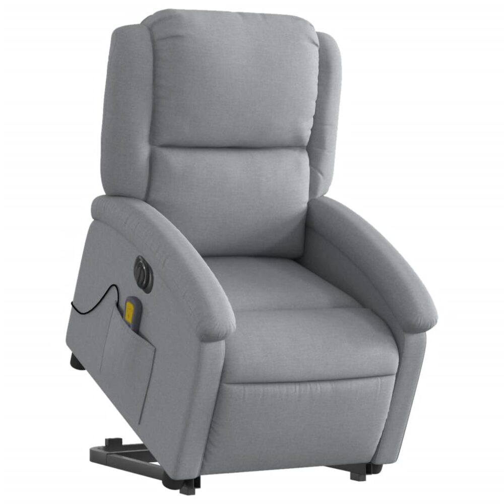 Sente-se e relaxe nesta poltrona reclinável, elevatória e elétrica de massagens altamente confortável! Função elevatória: a poltrona reclinável para idosos está equipada com um motor elétrico para a função de elevação. Graças à função que empurra toda a poltrona para cima, pode facilmente levantar-se sem criar desconforto às suas costas e joelhos com o simples premir de um botão.Função de reclinação elétrica: esta poltrona reclinável está também equipada com um motor elétrico que permite ajustar automaticamente o encosto e o apoio de pés para qualquer posição, de acordo com as suas necessidades de conforto, com um simples toque no botão existente na parte lateral. Este recurso permite uma inclinação máxima de 135 graus. Além disso, o encosto pode voltar para a posição original rápida e facilmente se premir o botão.Função de vibração: os 6 pontos de massagem permitem que experiencie uma massagem mais bem orientada. O controlo manual incluído permite-lhe ainda escolher diferentes programas de massagem. A função de massagens é alimentada pelo conector USB que exige uma fonte de alimentação USB certificada de 5V (não incluída).Experiência de assento confortável: o assento e o encosto espessamente acolchoados e os apoios de braços largos cobertos com tecido proporcionam uma sensação acolhedora e aconchegante, fazendo-o sentir-se abraçado enquanto está sentado. O tecido apresenta um aspeto simples e liso, sendo também respirável e durável.Bolso lateral conveniente: esta poltrona possui um bolso lateral para o seu controlo remoto ou para manter os seus artigos essenciais ao alcance.Estrutura sólida e estável: a estrutura feita de madeira e metal proporciona uma estrutura forte e estável. Esta poltrona reclinável é confortável e durável.