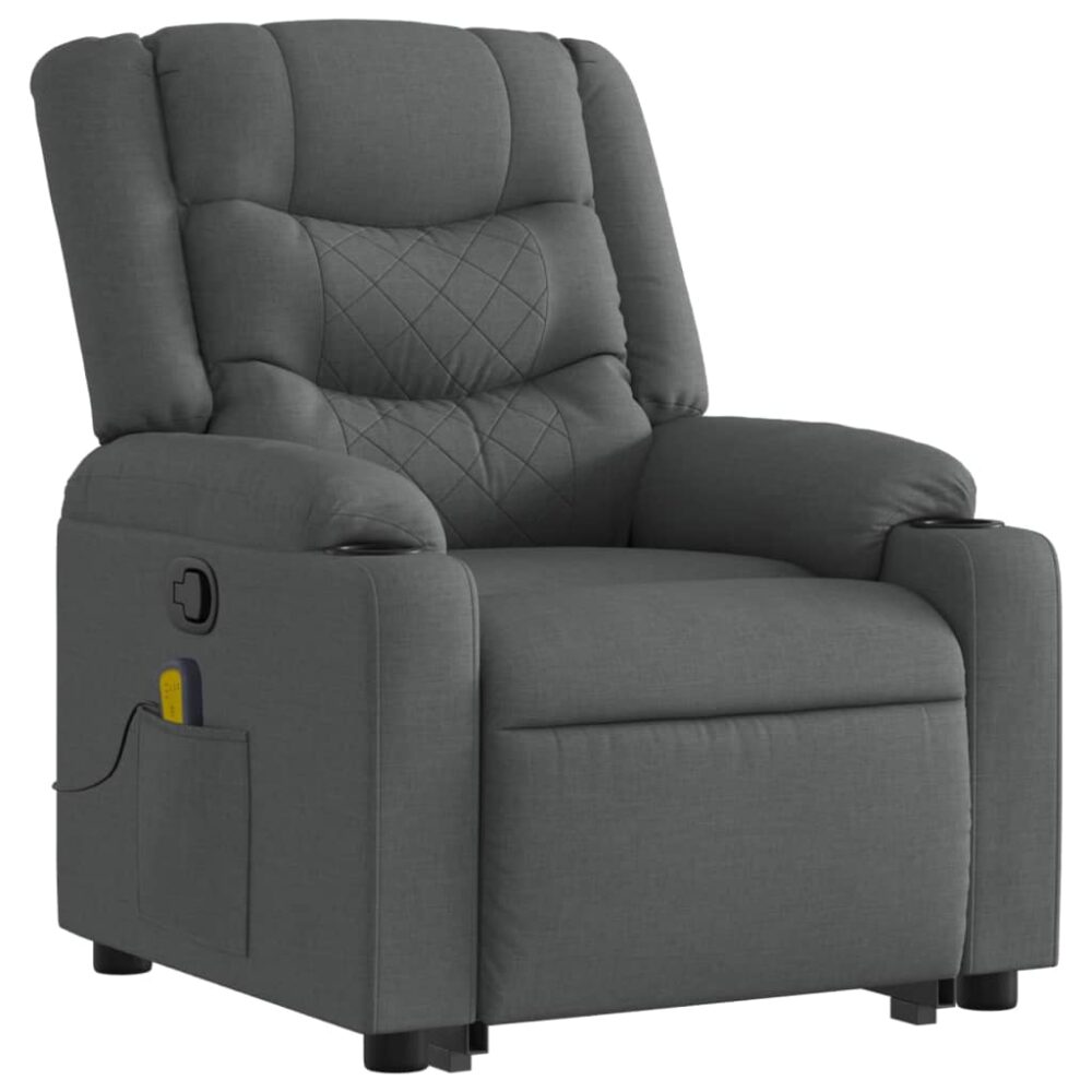 Sente-se e relaxe nesta poltrona de massagens reclinável elevatória altamente confortável! Função elevatória: a poltrona reclinável para idosos está equipada com um motor elétrico para a função de elevação. Graças à função que empurra toda a poltrona para cima, pode facilmente levantar-se sem criar desconforto às suas costas e joelhos com o simples premir de um botão.Função de reclinação manual: esta poltrona reclinável possui uma pega no lado direito. Pode ajustar manualmente o encosto e o apoio de pés em qualquer posição, de acordo com as suas necessidades de conforto, ao puxar a pega. Este recurso permite uma inclinação máxima de 135 graus. Além disso, o encosto pode voltar para a posição original rápida e facilmente se puxar a pega.Função de vibração: os 6 pontos de massagem permitem que experiencie uma massagem mais bem orientada. O controlo manual incluído permite-lhe ainda escolher diferentes programas de massagem. A função de massagens é alimentada pelo conector USB que exige uma fonte de alimentação USB certificada de 5V (não incluída).Experiência de assento confortável: o assento e encosto espessamente acolchoados e os apoios de braços largos cobertos de tecido proporcionam uma sensação quente e aconchegante, fazendo-o sentir-se abraçado enquanto está sentado. O tecido apresenta um aspeto simples e liso, sendo também respirável e durável.Bolso lateral conveniente: esta poltrona possui um bolso lateral para o seu controlo remoto ou para manter os seus artigos essenciais ao alcance.Estrutura sólida e estável: a estrutura feita de madeira e metal proporciona uma estrutura forte e estável. Esta poltrona reclinável é confortável e durável. Esteja ciente do risco de fogos abertos e outras fontes de calor forte nas proximidades do produto. Máximo de 110 kg por assento. Este aparelho pode ser utilizado por crianças a partir dos 8 anos de idade e por pessoas com capacidades físicas, sensoriais ou mentais reduzidas, ou com falta de experiência e conhecimentos, desde que tenham recebido supervisão ou instruções relativas à utilização do aparelho de forma segura e compreendam os perigos envolvidos. As crianças não devem brincar com o aparelho. A limpeza e a manutenção a serem efetuadas pelo utilizador não devem ser levadas a cabo por crianças sem supervisão.