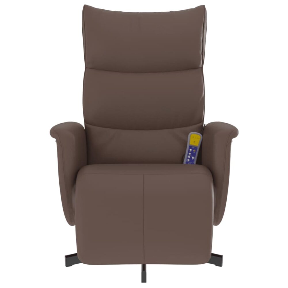 Sente-se e relaxe nesta poltrona de massagens reclinável altamente confortável! Função de vibração: os 6 pontos de massagem permitem que experiencie uma massagem mais bem orientada. O controlo manual incluído permite-lhe ainda escolher diferentes programas de massagem. A função de massagens é alimentada pelo conector USB que exige uma fonte de alimentação USB certificada de 5V (não incluída).Encosto e apoio de pés ajustáveis: esta poltrona de massagens foi especialmente concebida com uma função de reclinação, permitindo-lhe ajustar o encosto e o apoio de pés de acordo com as suas necessidades de conforto. O encosto pode ser inclinado de 105 a 125 graus.Giratória a 360 graus: pode girar livremente a poltrona de massagens reclinável a 360 graus, dando-lhe uma flexibilidade adicional.Experiência de assento confortável: o assento e encosto espessamente acolchoados e os apoios de braços largos cobertos com couro artificial proporcionam uma sensação quente e aconchegante, fazendo-o sentir-se abraçado enquanto está sentado. O couro artificial é um material altamente durável. É resistente a manchas, sendo fácil de limpar com um pano húmido. A superfície suave concede-lhe também um aspeto luxuoso e a beleza do couro genuíno.Estrutura sólida e estável: a armação feita de contraplacado e metal proporciona uma estrutura forte e estável. Esta cadeira de massagens reclinável é confortável e durável. Dica útil:Para economizar espaço, algumas peças ou almofadas são embaladas dentro do móvel — verifique se há componentes ocultos nos compartimentos com zíper ou abaixo da capa do assento. Ter em atenção o risco de fogos abertos e outras fontes de calor forte nas proximidades do produto. Máximo de 110 kg por assento. Este produto é alimentado por CC 5V, mas a fonte de alimentação USB de 5V certificada não está incluída. Uma tensão mais elevada pode provocar um sobreaquecimento e resultar em danos no dispositivo e no risco potencial de sobreaquecimento e incêndio.
