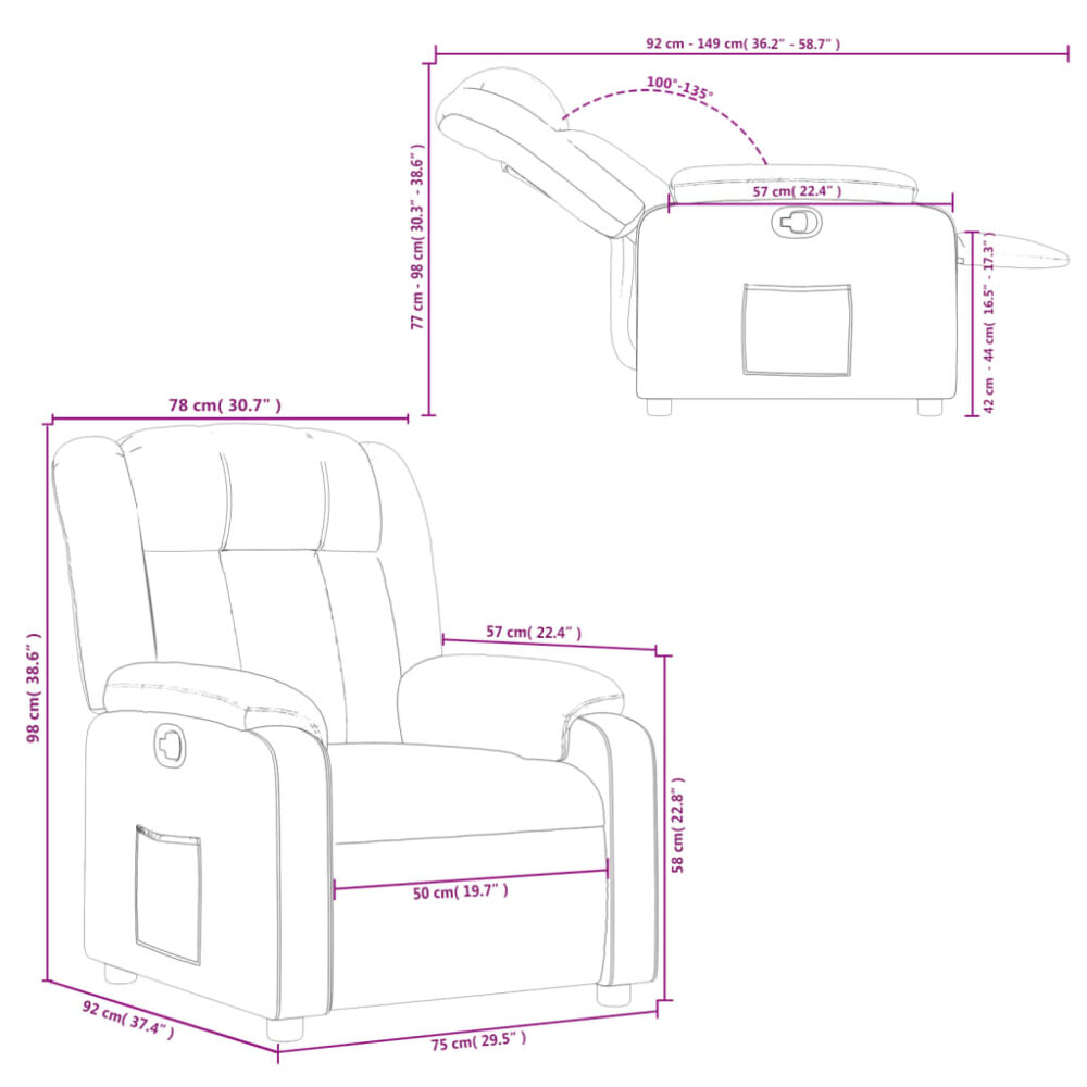 Sente-se e relaxe nesta poltrona reclinável altamente confortável! Função de reclinação manual: esta poltrona reclinável possui uma pega no lado direito. Pode ajustar manualmente o encosto e o apoio de pés em qualquer posição, de acordo com as suas necessidades de conforto, ao puxar a pega. Este recurso permite uma inclinação máxima de 135 graus. Além disso, o encosto pode voltar para a posição original rápida e facilmente se puxar a pega.Experiência de assento confortável: o assento e encosto espessamente acolchoados e os apoios de braços largos cobertos com couro artificial proporcionam uma sensação aconchegante, fazendo-o sentir-se abraçado enquanto está sentado. O couro artificial é um material altamente durável. É resistente a manchas, sendo fácil de limpar com um pano húmido. A superfície suave concede-lhe também um aspeto luxuoso e a beleza do couro genuíno.Bolso lateral conveniente: esta poltrona possui um bolso lateral para que possa manter os seus artigos essenciais ao seu alcance.Estrutura sólida e estável: a estrutura feita de madeira e metal proporciona uma estrutura forte e estável. Esta poltrona reclinável é confortável e durável. Máximo de 110 kg por lugar.