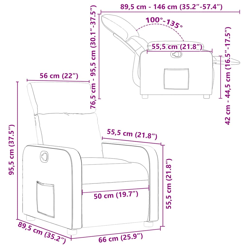 Sente-se e relaxe nesta poltrona reclinável altamente confortável! Função de reclinação manual: esta poltrona reclinável possui uma pega no lado direito. Pode ajustar manualmente o encosto e o apoio de pés em qualquer posição, de acordo com as suas necessidades de conforto, ao puxar a pega. Este recurso permite uma inclinação máxima de 135 graus. Além disso, o encosto pode voltar para a posição original rápida e facilmente se puxar a pega.Experiência de assento confortável: o assento e encosto espessamente acolchoados e os apoios de braços largos cobertos com couro artificial proporcionam uma sensação aconchegante, fazendo-o sentir-se abraçado enquanto está sentado. O couro artificial é um material altamente durável. É resistente a manchas, sendo fácil de limpar com um pano húmido. A superfície suave concede-lhe também um aspeto luxuoso e a beleza do couro genuíno.Bolso lateral conveniente: esta poltrona possui um bolso lateral para que possa manter os seus artigos essenciais ao seu alcance.Estrutura sólida e estável: a estrutura feita de madeira e metal proporciona uma estrutura forte e estável. Esta poltrona reclinável é confortável e durável. Máximo de 110 kg por assento. Ter em atenção o risco de fogos abertos e outras fontes de calor forte nas proximidades do produto.