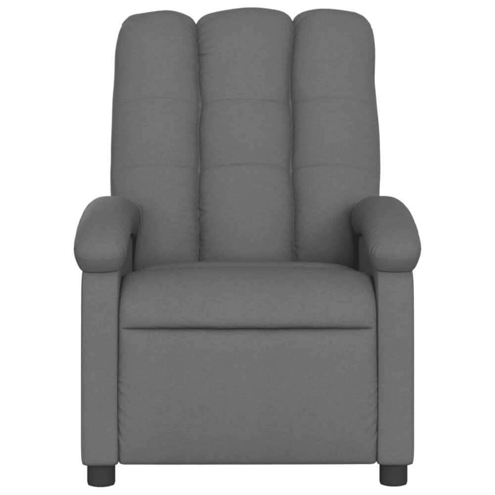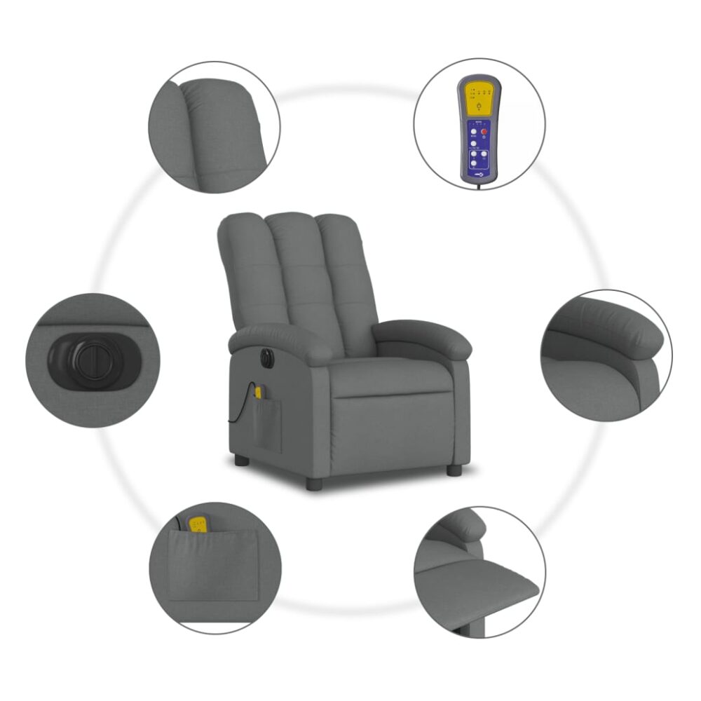 Sente-se e relaxe nesta poltrona de massagens reclinável elétrica altamente confortável! Função de reclinação elétrica: esta poltrona reclinável está equipada com um motor elétrico que permite ajustar automaticamente o encosto e o apoio de pés para qualquer posição, de acordo com as suas necessidades de conforto, com um simples toque no botão existente na parte lateral. Este recurso permite uma inclinação máxima de 135 graus. Além disso, o encosto pode voltar para a posição original rápida e facilmente se premir o botão.Função de vibração: os 6 pontos de massagem permitem que experiencie uma massagem mais bem orientada. O controlo manual incluído permite-lhe ainda escolher diferentes programas de massagem. A função de massagens é alimentada pelo conector USB que exige uma fonte de alimentação USB certificada de 5V (não incluída).Experiência de assento confortável: o assento e encosto espessamente acolchoados e os apoios de braços largos cobertos de tecido proporcionam uma sensação quente e aconchegante, fazendo-o sentir-se abraçado enquanto está sentado. O tecido apresenta um aspeto simples e liso, sendo também respirável e durável.Bolso lateral conveniente: esta poltrona possui um bolso lateral para o seu controlo remoto ou para manter os seus artigos essenciais ao alcance.Estrutura sólida e estável: a estrutura feita de madeira e metal proporciona uma estrutura forte e estável. Esta poltrona reclinável é confortável e durável.