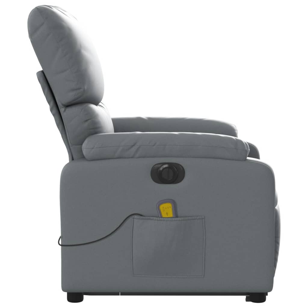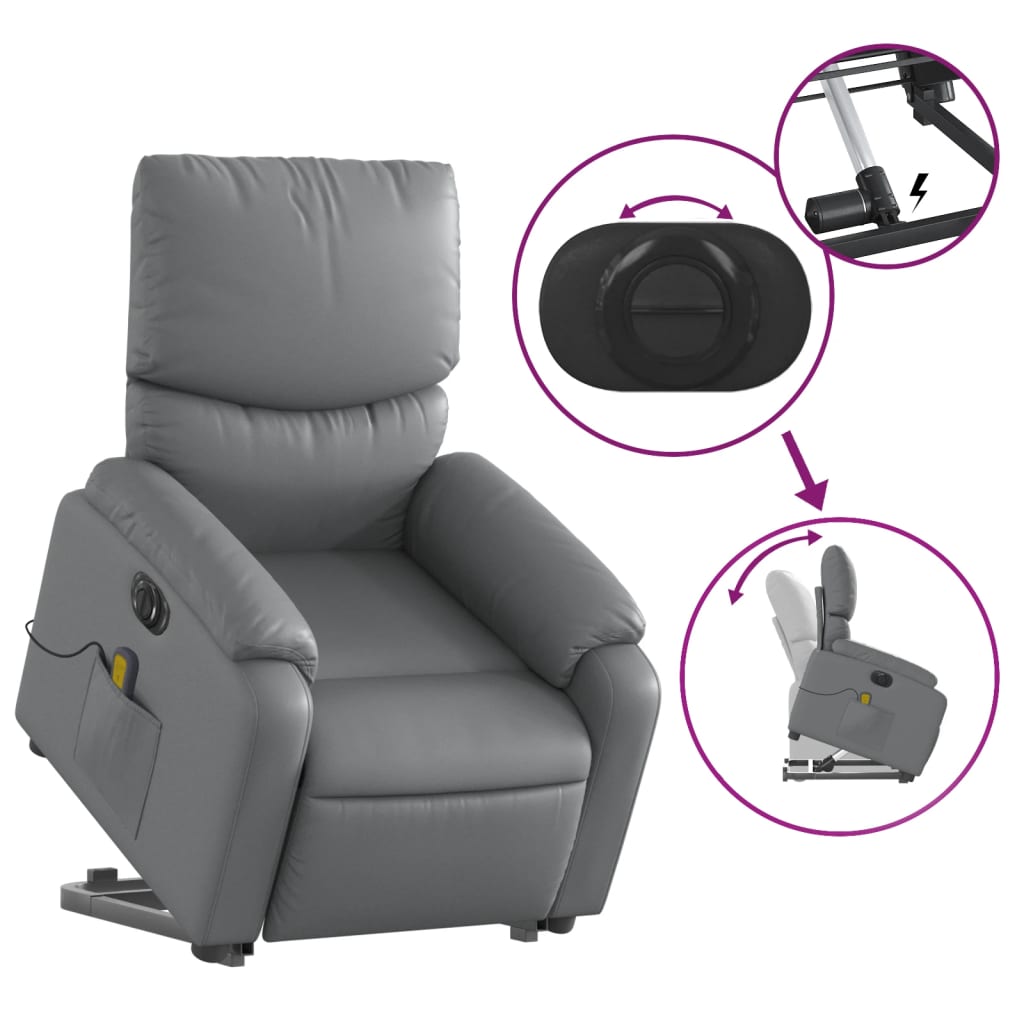 Sente-se e relaxe nesta poltrona reclinável, elevatória e elétrica de massagens altamente confortável! Função elevatória: a poltrona reclinável para idosos está equipada com um motor elétrico para a função de elevação. Graças à função que empurra toda a poltrona para cima, pode facilmente levantar-se sem criar desconforto às suas costas e joelhos com o simples premir de um botão.Função de reclinação elétrica: esta poltrona reclinável está também equipada com um motor elétrico que permite ajustar automaticamente o encosto e o apoio de pés para qualquer posição, de acordo com as suas necessidades de conforto, com um simples toque no botão existente na parte lateral. Este recurso permite uma inclinação máxima de 135 graus. Além disso, o encosto pode voltar para a posição original rápida e facilmente se premir o botão.Função de vibração: os 6 pontos de massagem permitem que experiencie uma massagem mais bem orientada. O controlo manual incluído permite-lhe ainda escolher diferentes programas de massagem. A função de massagens é alimentada pelo conector USB que exige uma fonte de alimentação USB certificada de 5V (não incluída).Experiência de assento confortável: o assento e encosto espessamente acolchoados e os apoios de braços largos cobertos com couro artificial proporcionam uma sensação aconchegante, fazendo-o sentir-se abraçado enquanto está sentado. O couro artificial é um material altamente durável. É resistente a manchas, sendo fácil de limpar com um pano húmido. A superfície suave concede-lhe também um aspeto luxuoso e a beleza do couro genuíno.Bolso lateral conveniente: esta poltrona possui um bolso lateral para o seu controlo remoto ou para manter os seus artigos essenciais ao alcance.Estrutura sólida e estável: a estrutura feita de madeira e metal proporciona uma estrutura forte e estável. Esta poltrona reclinável é confortável e durável.