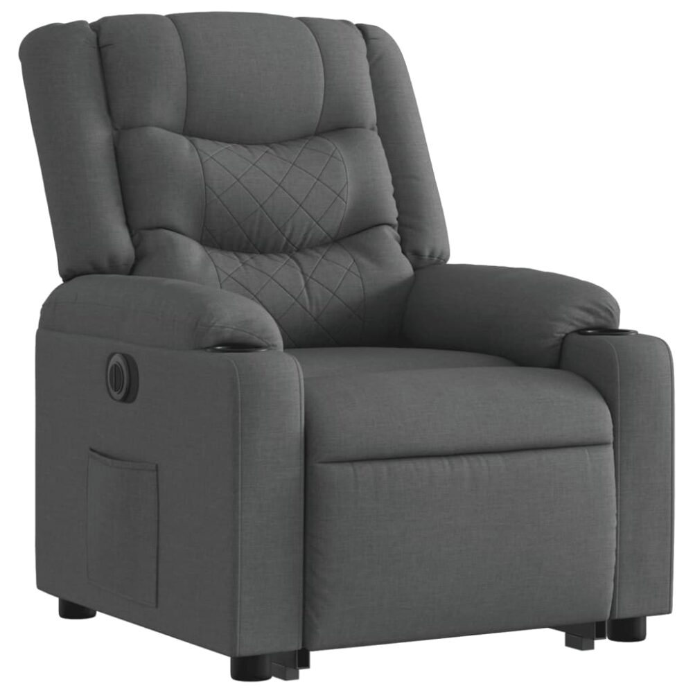 Sente-se e relaxe nesta poltrona reclinável elevatória elétrica altamente confortável! Função elevatória: a poltrona reclinável para idosos está equipada com um motor elétrico para a função de elevação. Graças à função que empurra toda a poltrona para cima, pode facilmente levantar-se sem criar desconforto às suas costas e joelhos com o simples premir de um botão.Função de reclinação elétrica: esta poltrona reclinável está também equipada com um motor elétrico que permite ajustar automaticamente o encosto e o apoio de pés para qualquer posição, de acordo com as suas necessidades de conforto, com um simples toque no botão existente na parte lateral. Este recurso permite uma inclinação máxima de 135 graus. Além disso, o encosto pode voltar para a posição original rápida e facilmente se premir o botão.Experiência de assento confortável: o assento e o encosto espessamente acolchoados e os apoios de braços largos cobertos com tecido proporcionam uma sensação acolhedora e aconchegante, fazendo-o sentir-se abraçado enquanto está sentado. O tecido apresenta um aspeto simples e liso, sendo também respirável e durável.Bolso lateral conveniente: esta poltrona possui um bolso lateral para que possa manter os seus artigos essenciais ao seu alcance.Estrutura sólida e estável: a estrutura feita de madeira e metal proporciona uma estrutura forte e estável. Esta poltrona reclinável é confortável e durável. Esteja ciente do risco de fogos abertos e outras fontes de calor forte nas proximidades do produto. Máximo de 110 kg por assento. Este aparelho pode ser utilizado por crianças a partir dos 8 anos de idade e por pessoas com capacidades físicas, sensoriais ou mentais reduzidas, ou com falta de experiência e conhecimentos, desde que tenham recebido supervisão ou instruções relativas à utilização do aparelho de forma segura e compreendam os perigos envolvidos. As crianças não devem brincar com o aparelho. A limpeza e a manutenção a serem efetuadas pelo utilizador não devem ser levadas a cabo por crianças sem supervisão.