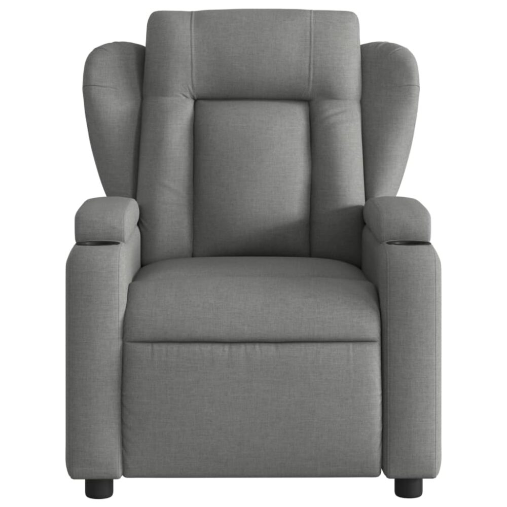 Sente-se e relaxe nesta poltrona reclinável altamente confortável! Função de reclinação manual: esta poltrona reclinável possui uma pega no lado direito. Pode ajustar manualmente o encosto e o apoio de pés em qualquer posição, de acordo com as suas necessidades de conforto, ao puxar a pega. Este recurso permite uma inclinação máxima de 135 graus. Além disso, o encosto pode voltar para a posição original rápida e facilmente se puxar a pega.Experiência de assento confortável: o assento e encosto espessamente acolchoados e os apoios de braços largos cobertos de tecido proporcionam uma sensação quente e aconchegante, fazendo-o sentir-se abraçado enquanto está sentado. O tecido apresenta um aspeto simples e liso, sendo também respirável e durável.Suportes de copos e bolso lateral convenientes: esta poltrona possui dois convenientes suportes de copos para as suas bebidas e um bolso lateral para manter os seus artigos essenciais ao alcance.Estrutura sólida e estável: a estrutura feita de madeira e metal proporciona uma estrutura forte e estável. Esta poltrona reclinável é confortável e durável.