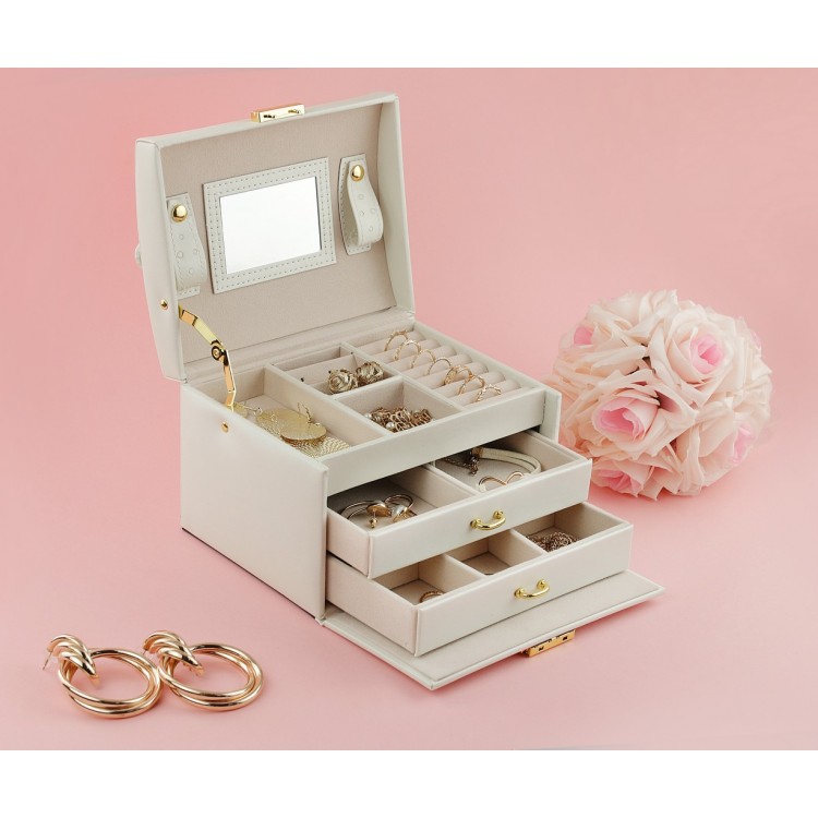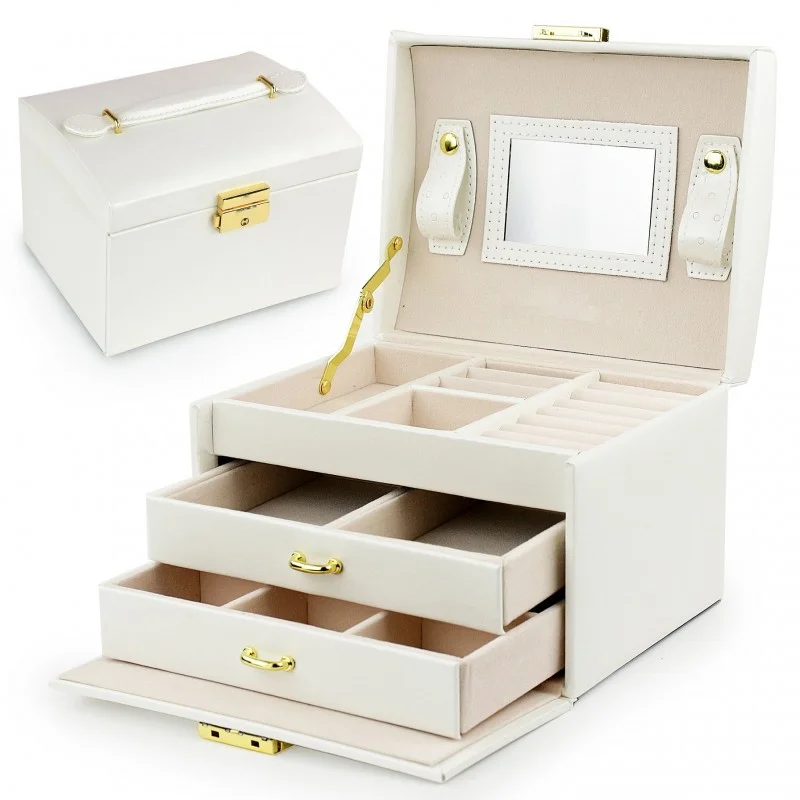 – Tem compartimentos de armazenamento para: anéis, brincos, colares e muito mais