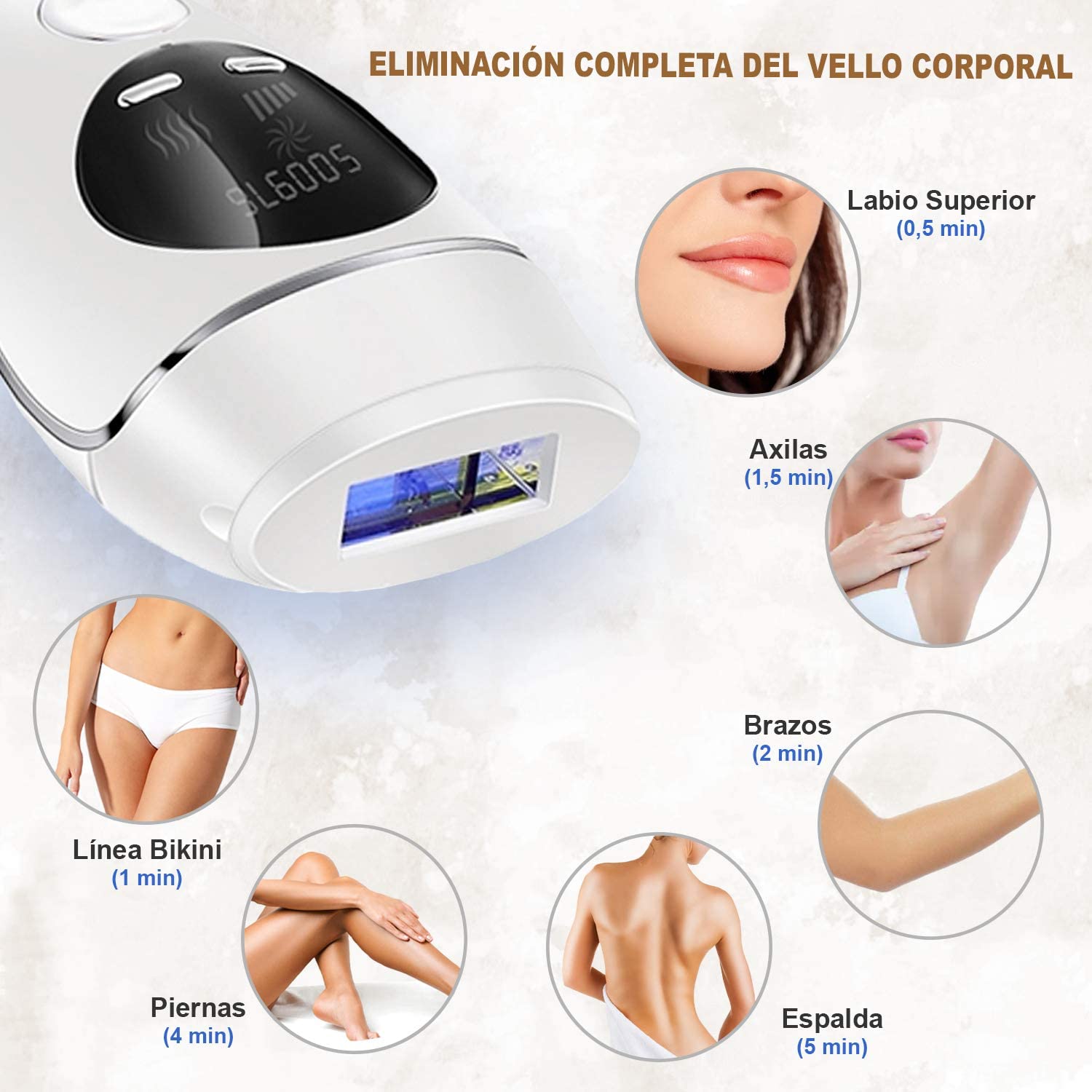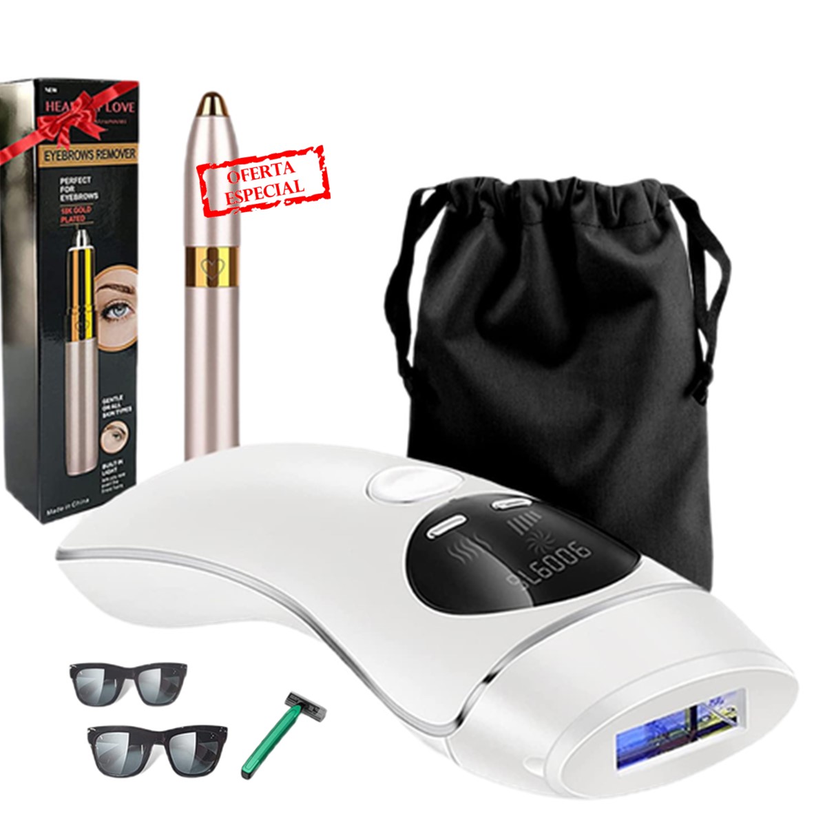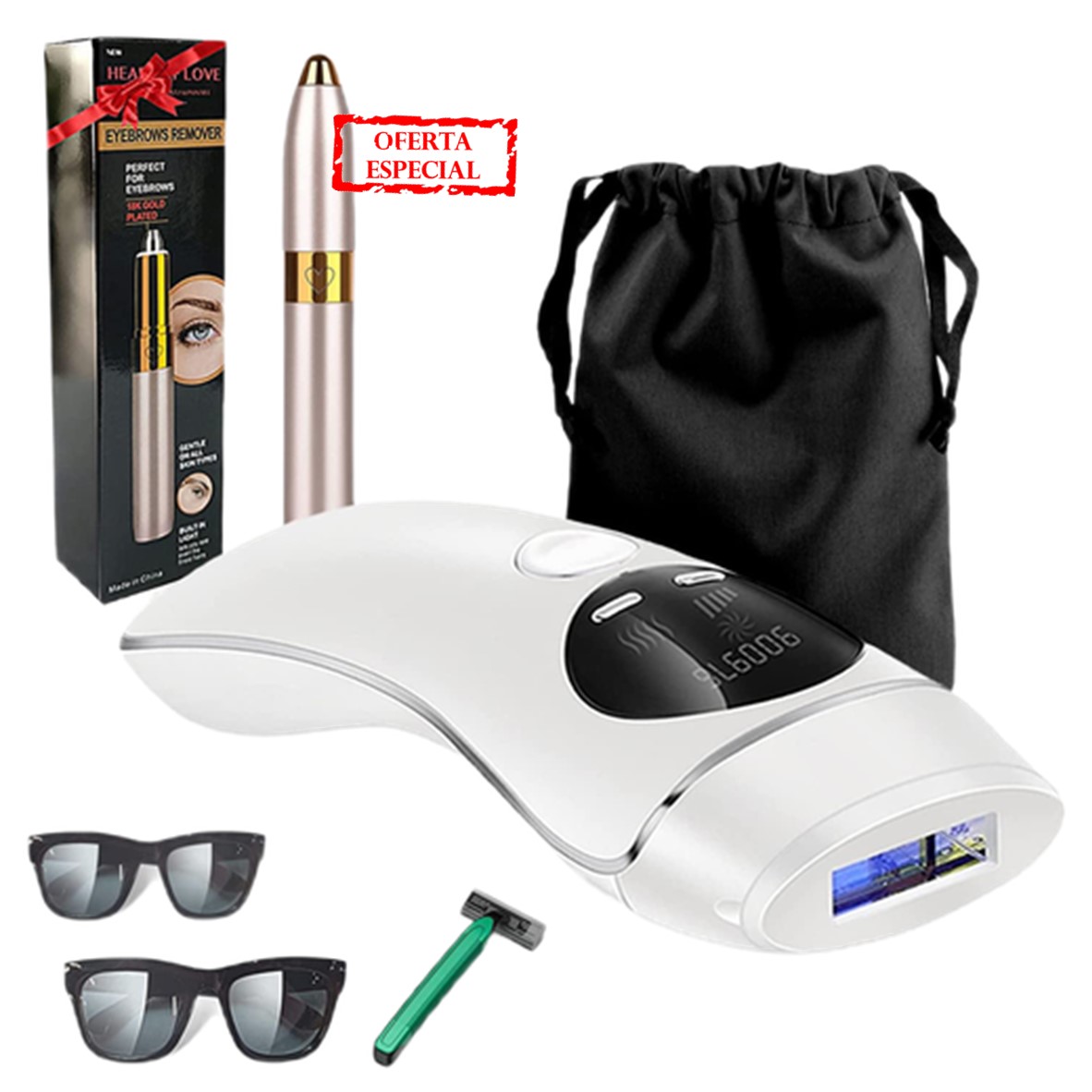 Para uma depilação perfeita do corpo, está incluído um depilador de sobrancelhas portátil com luz LED e recarregável via USB de Oferta