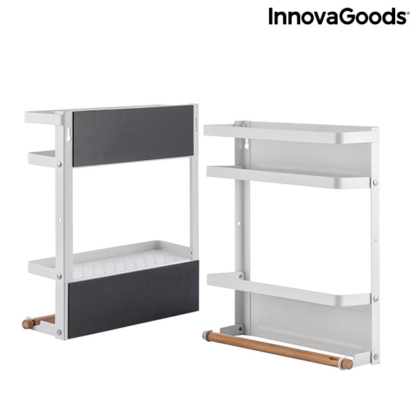 Uma versátil e resistente prateleira organizadora magnética, muito útil para aproveitar espaços e ter à mão os objetos de cozinha, banho, etc., como frascos, latas, rolos de papel, panos, toalhas, utensílios de cozinha, produtos de limpeza, etc. Inclui duas prateleiras que podem ser penduradas com facilidade, uma barra de segurança para evitar que o objetos caiam, dois ganchos móveis e uma barra de madeira para rolos, panos, etc. Permite poupar espaço e manter a ordem. A prateleira suporta até 5 kg de peso e é ideal para colocar no frigorífico ou na lateral da máquina de lavar ou de secar, etc. O inovador design magnético facilita a instalação sem necessidade de montagem nem de ferramentas, uma vez que adere facilmente a superfície metálicas. Com 2 orifícios para o caso de preferir fixá-la (inclui 2 buchas e 2 parafusos).