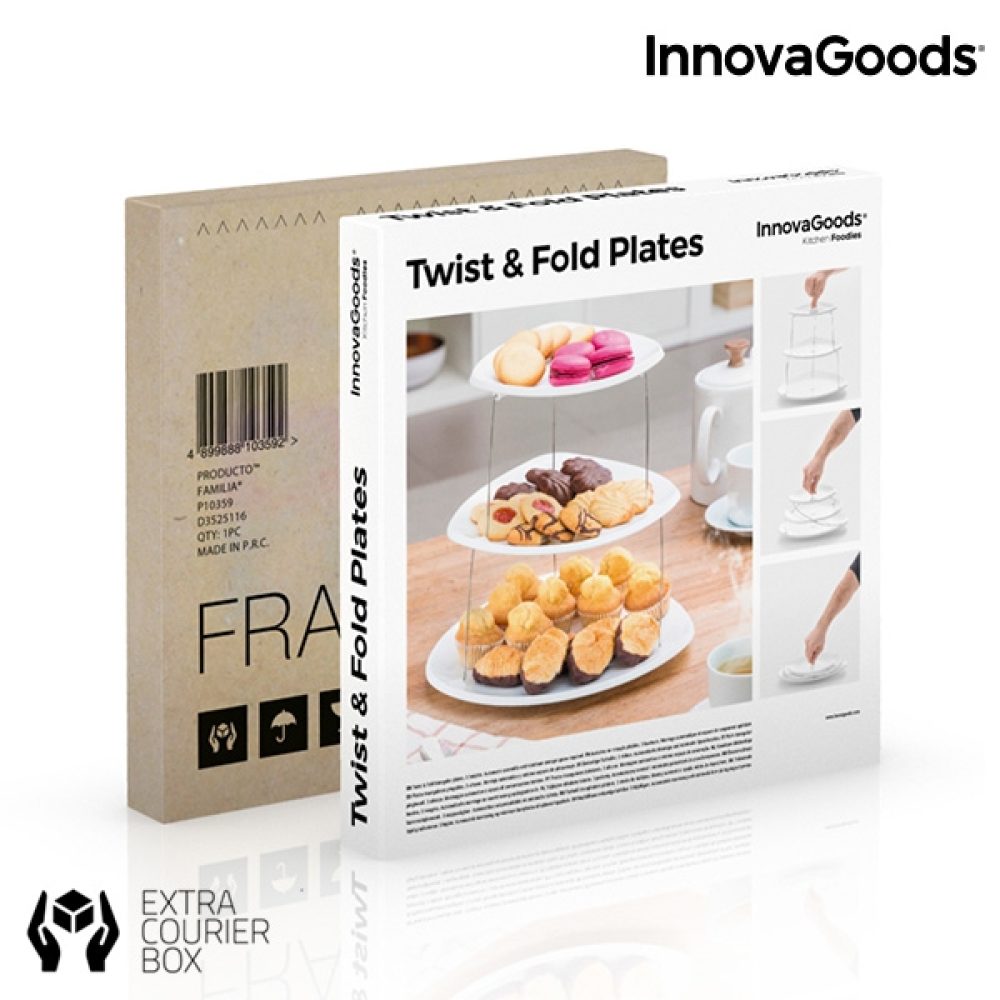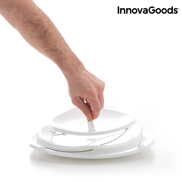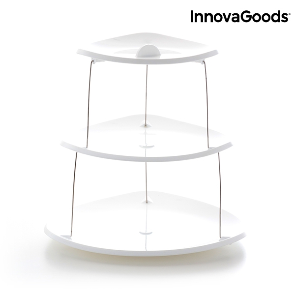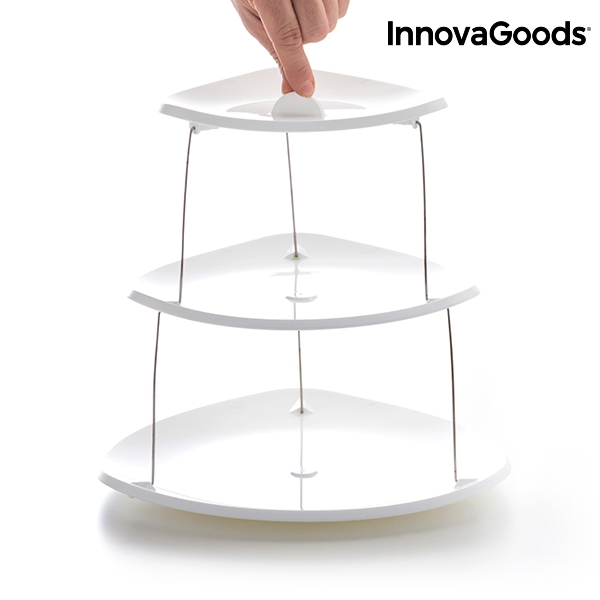 Uma inovadora e prática invenção que não pode faltar nas cozinhas mais modernas e originais! Quando desdobrado, possui forma de torre que consiste em 3 pratos unidos entre si por uma estrutura metálica. Para desdobrar basta rodar e esticar para cima. Também se dobra com facilidade ao rodar e pressionar para baixo. Ocupa o mínimo espaço ao servir os aperitivos na mesa e ao guardar nos armários da cozinha.