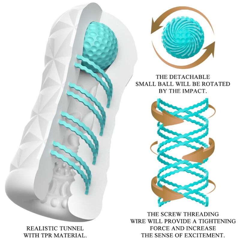 Pequena ferramenta para diversão gigantesca com masturbação! Este masturbador transparente e reutilizável possui uma espiral giratória e uma bola de estimulação na lateral, a espiral giratória faz o masturbador girar durante a penetração e a bola na parte superior pode estimular o ponto certo e dar uma nova sensação. A bainha possui em seu interior uma textura estimulante e excitante que massageia o pênis de forma intensa e dinâmica durante o trabalho manual. Você pode usar este masturbador elegante e adequado para a pele repetidamente. Muito fácil de usar e puro prazer!