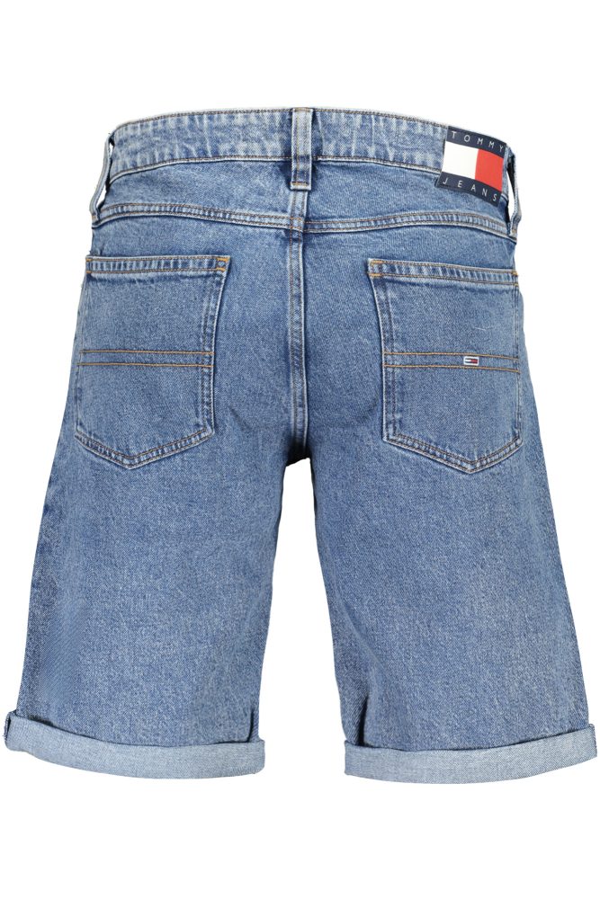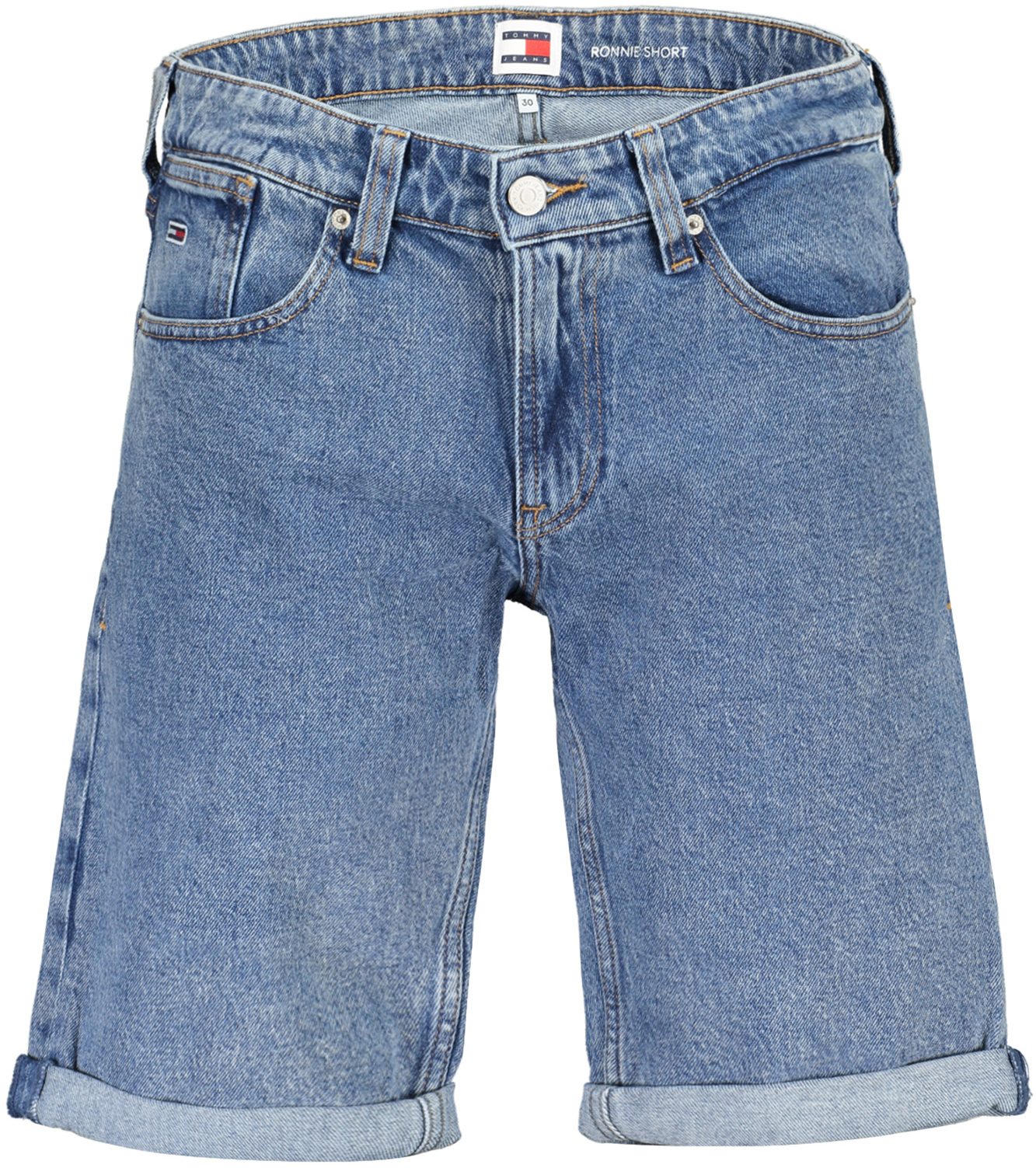 Calções de ganga com 5 bolsos, efeito desbotado, zíper e botão, logótipo bordado, algodão orgânico.