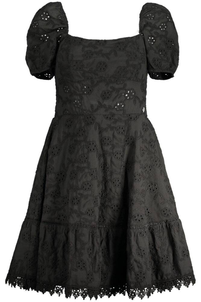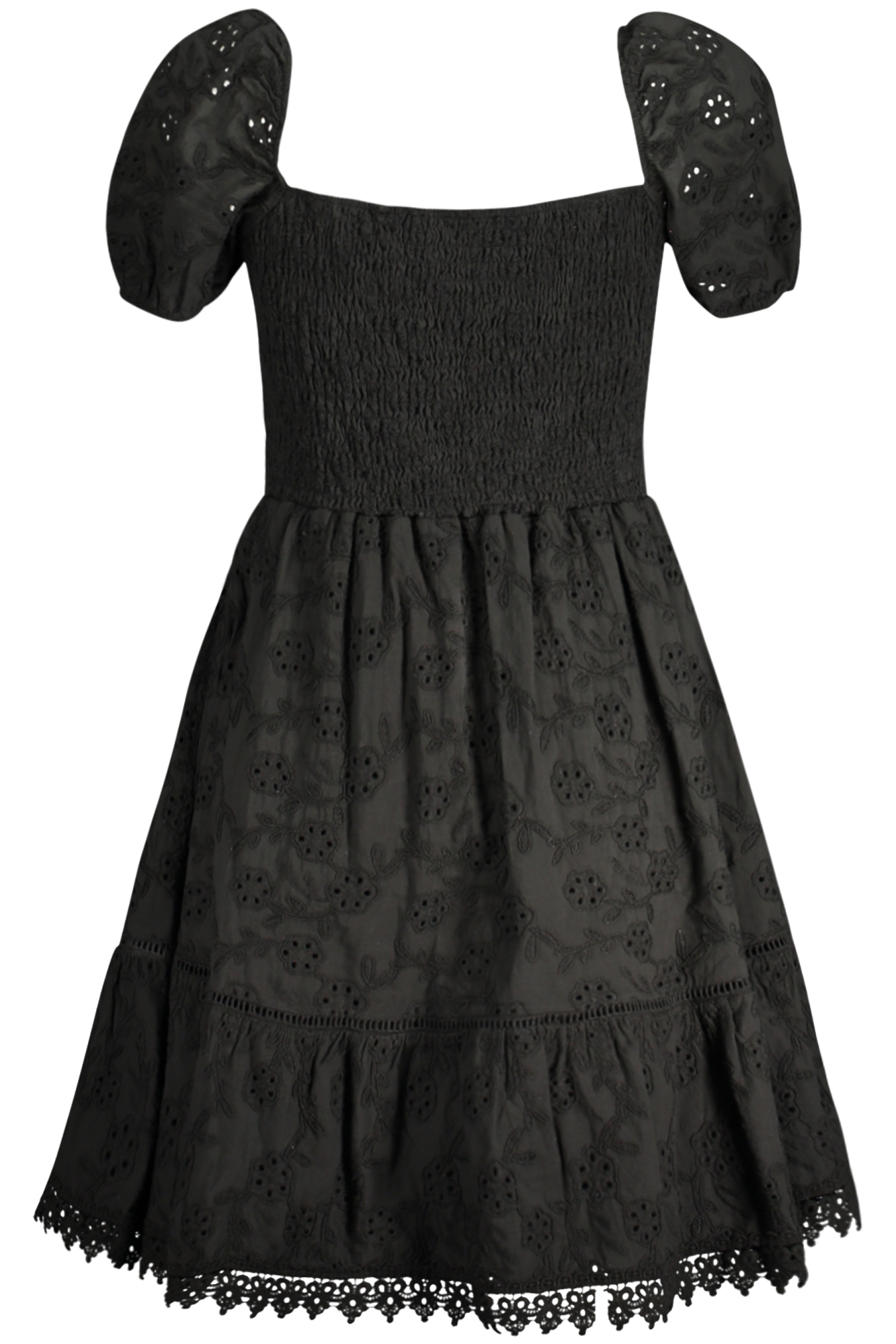 Vestido curto, mangas curtas, decote em barco, bordado, logótipo