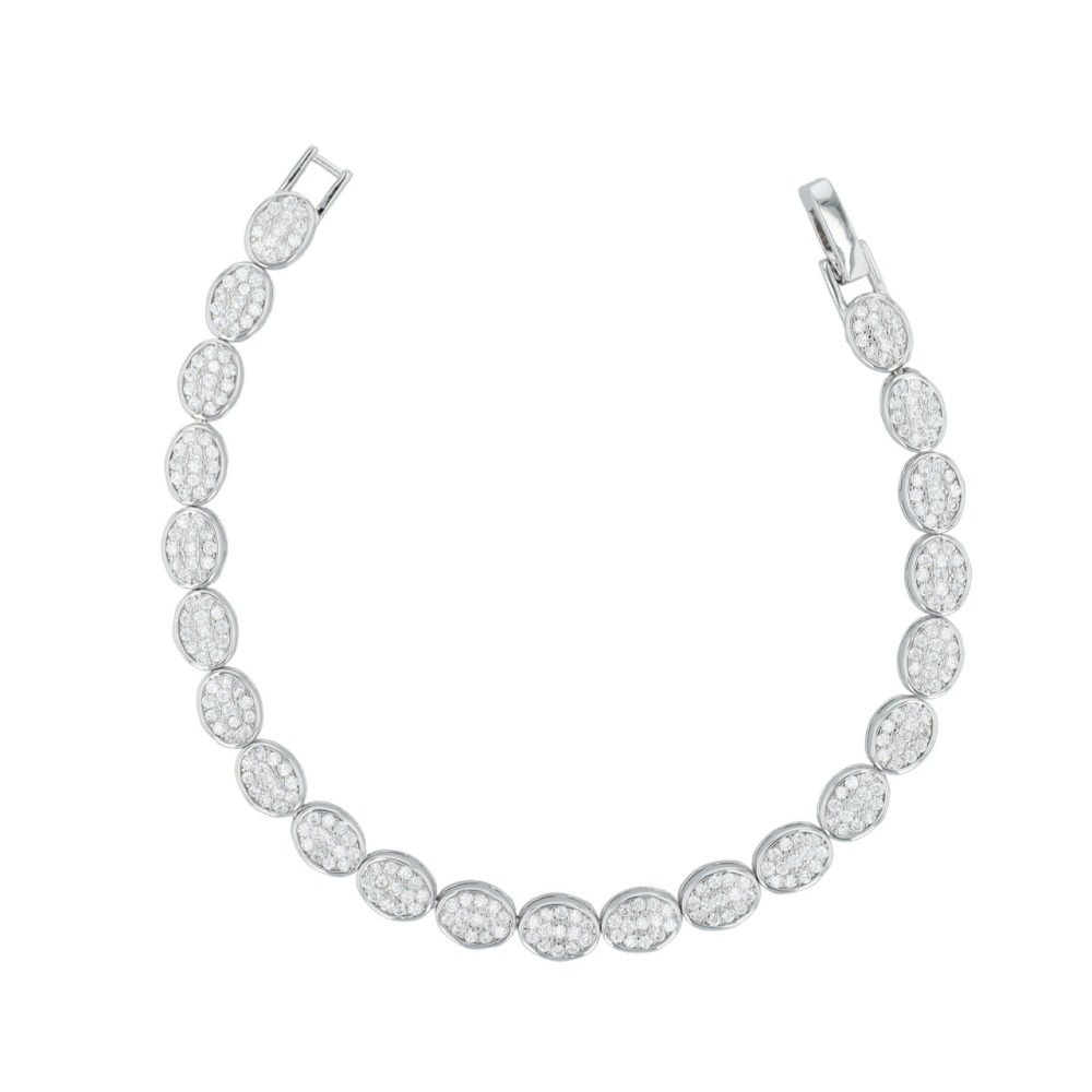 A pulseira “Alpina” é feita de prata esterlina 925 de alta qualidade e coberta com uma camada protetora de ródio. Esse acabamento protege a joia de manchas e arranhões, o que garante a longevidade e a beleza da pulseira. O design é caracterizado pela sua construção única de elementos ovais que se unem perfeitamente. Cada um desses elementos é totalmente cravejado com pedras brilhantes de zircónia. A pulseira está disponível em comprimentos de 18 cm ou 19 cm, 5,5 mm de largura e 3,5 mm de espessura, permitindo uma presença robusta e elegante no pulso. Essas opções de tamanho oferecem flexibilidade para diferentes tamanhos de pulso e garantem um ajuste ideal. Um fecho de clipe seguro mantém a pulseira firmemente no pulso e facilita a colocação e a retirada.