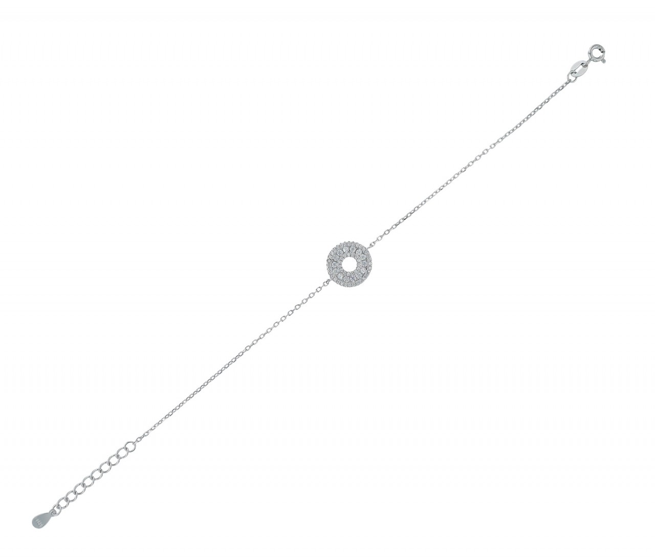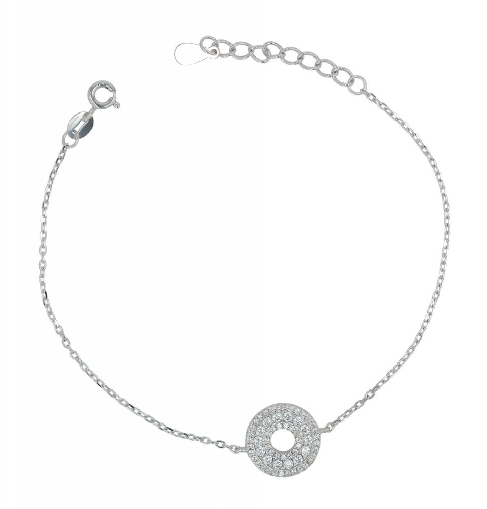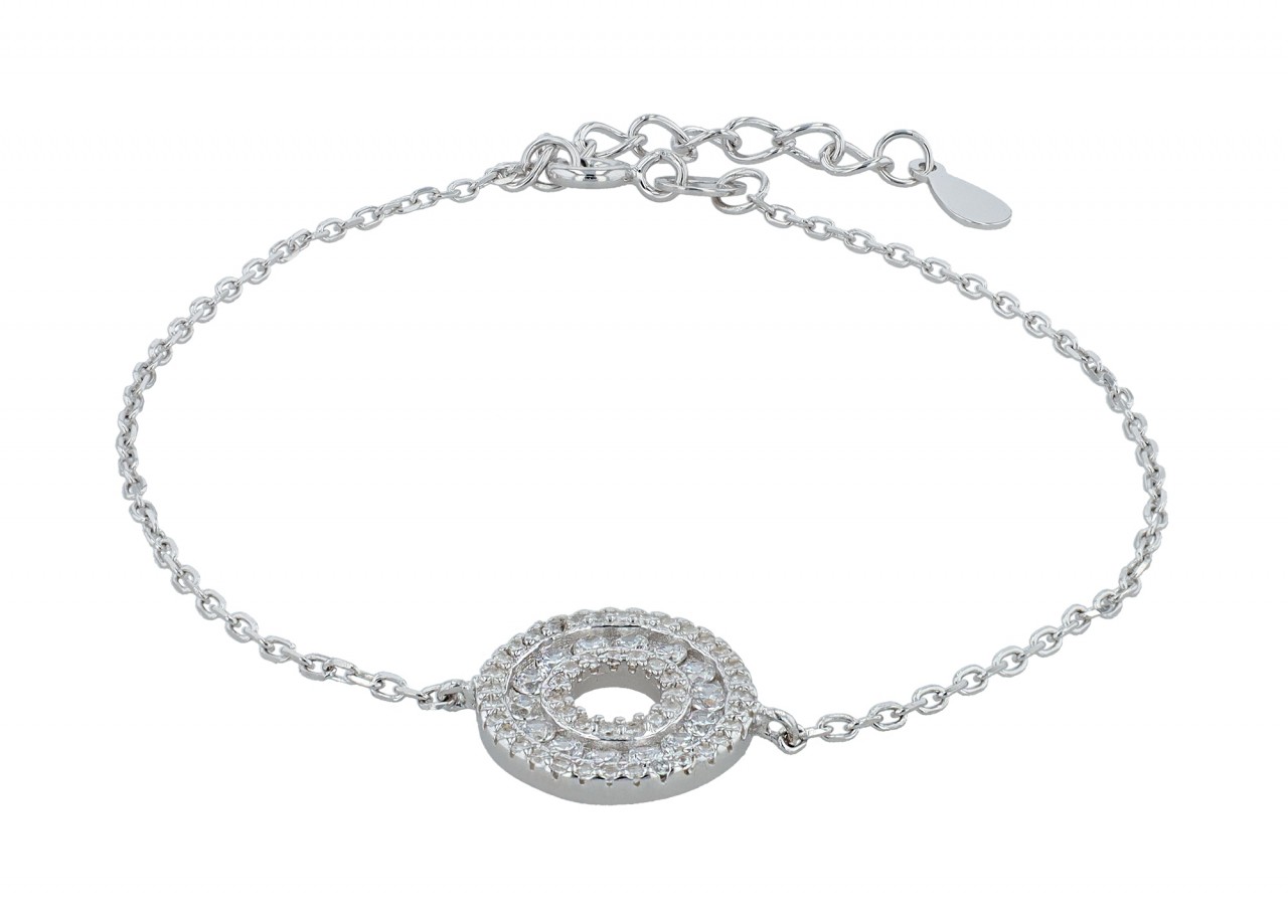 A pulseira “Kyra” impressiona pelo seu design sutil e detalhes brilhantes. É feita em prata de lei 925 e banhado a ródio, que mantém o brilho por um longo período e protege contra manchas. Essas propriedades o tornam um companheiro duradouro e de fácil manutenção. O design apresenta uma delicada corrente de prata que sustenta um elemento central redondo. Este elemento tem um diâmetro de 13 mm e é totalmente cravejado com pedras brilhantes de zircónia. Com um comprimento de 17 cm e uma corrente de extensão adicional de 3 cm, pode ser facilmente ajustado a diferentes tamanhos de pulso para um ajuste confortável. Um fecho lagosta redondo fixa a pulseira no pulso e facilita a colocação e a retirada.
