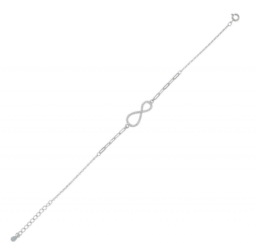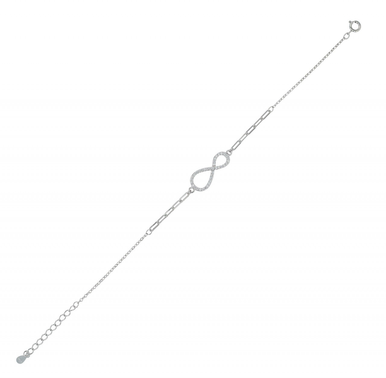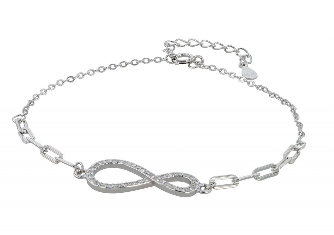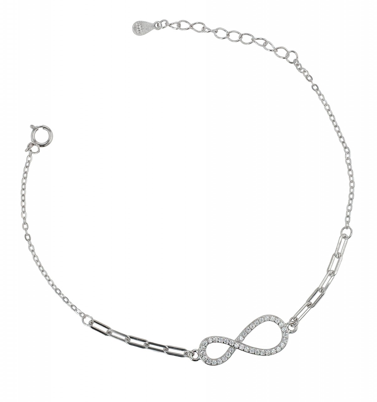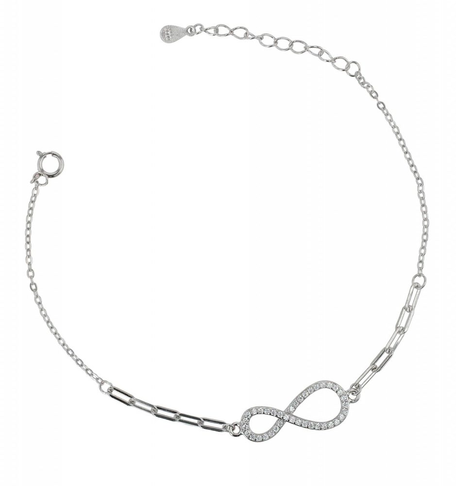 Feita em prata esterlina 925 e com acabamento banhado a ródio, esta pulseira não só oferece brilho excecional, mas também maior resistência a manchas. O banho de ródio garante uma beleza duradoura e faz da pulseira uma companheira duradoura. É caracterizada por dois tipos diferentes de correntes que fluem harmoniosamente uma na outra e possuem um símbolo do infinito no meio. Este símbolo é cravejado com elegantes pedras de zircónia que proporcionam um brilho impressionante. Medindo 17 cm de comprimento, complementado por um extensor adicional de 3 cm, esta pulseira cabe confortavelmente na maioria dos pulsos. A largura de 9 mm e a espessura de 1,5 mm garantem uma aparência presente mas discreta. Um mosquetão redondo seguro facilita a colocação e garante um ajuste seguro no pulso, tornando o uso prático e sem preocupações.