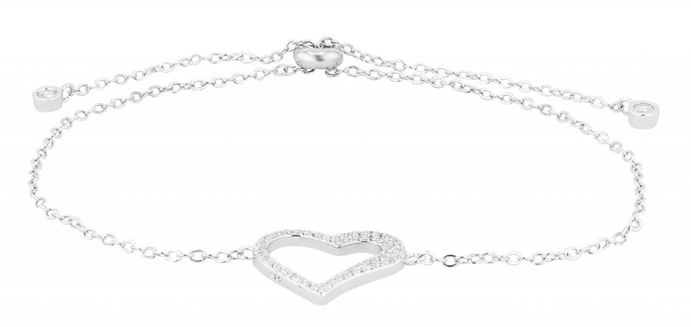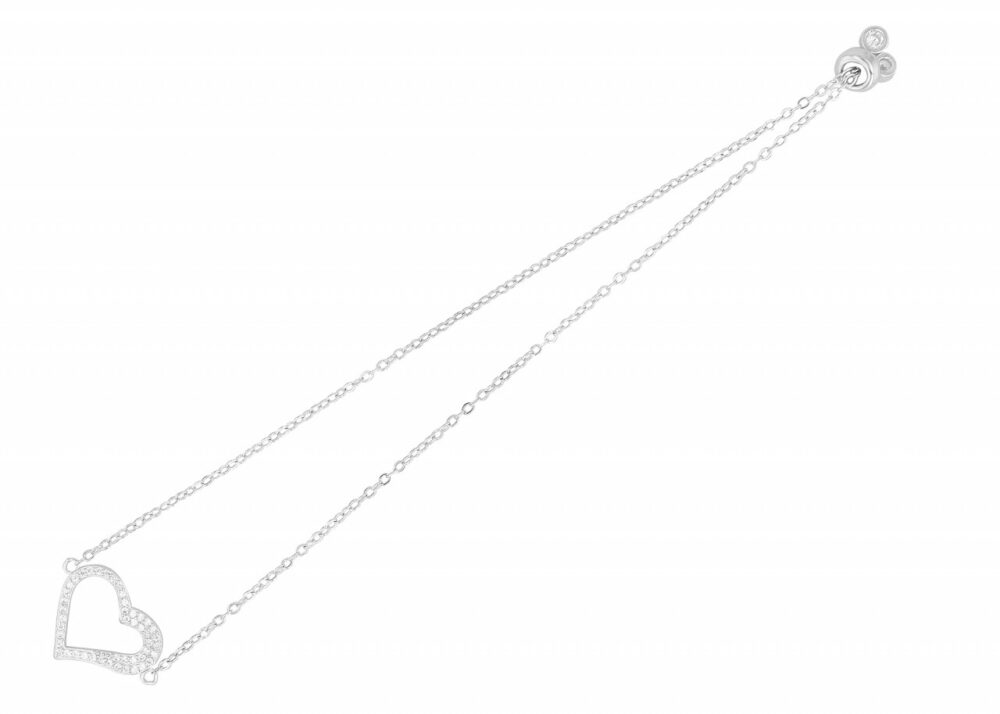 Feita em prata esterlina 925 de alta qualidade e com acabamento em superfície banhada a ródio, esta pulseira é caracterizada por sua durabilidade e brilho duradouro. O banho de ródio protege a prata contra manchas e garante que ela mantenha sua beleza mesmo após longos períodos de uso. Com comprimento total de 23 cm e espessura e largura de apenas 1 mm, esta delicada pulseira se ajusta suavemente ao pulso. O prático fecho de puxar permite um ajuste individual, podendo ser ajustado a qualquer tamanho de pulso e proporcionando sempre uma fixação segura. Um destaque desta pulseira é o elemento em forma de coração que interrompe a pulseira ao meio. O coração mede 13 x 20 mm e é engastado com pedras brilhantes de zircónia.