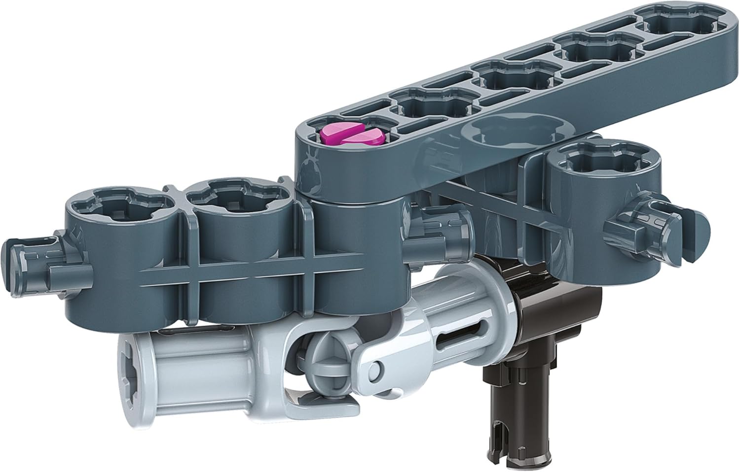 - O conjunto inclui engrenagens para construir um leme funcional e reproduzir o movimento alternativo dos pistões, tudo conectado a uma hélice por meio de um gimbal.