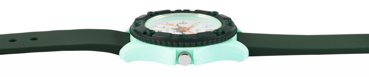 O relógio de pulso infantil analógico de 3 ponteiros da marca Q&Q possui um movimento de quartzo de alta qualidade. A pulseira de silicone verde escuro tem 16 mm de largura na alça e pode ser aberta e fechada com uma fivela de plástico verde claro. Graças ao material, o relógio não é apenas robusto, mas também garante conforto de uso. O comprimento total do relógio é de 24 cm. A caixa de plástico verde claro com vidro plástico tem um diâmetro de 35 mm e uma altura de caixa de 10 mm. O fundo da caixa é feito de aço inoxidável. O mostrador é branco e impresso com números coloridos, os três ponteiros são laranja. Além disso, o mostrador é decorado com um dinossauro e o relógio tem resistência à água de 10 ATM.
