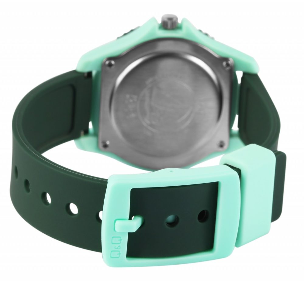 O relógio de pulso infantil analógico de 3 ponteiros da marca Q&Q possui um movimento de quartzo de alta qualidade. A pulseira de silicone verde escuro tem 16 mm de largura na alça e pode ser aberta e fechada com uma fivela de plástico verde claro. Graças ao material, o relógio não é apenas robusto, mas também garante conforto de uso. O comprimento total do relógio é de 24 cm. A caixa de plástico verde claro com vidro plástico tem um diâmetro de 35 mm e uma altura de caixa de 10 mm. O fundo da caixa é feito de aço inoxidável. O mostrador é branco e impresso com números coloridos, os três ponteiros são laranja. Além disso,…