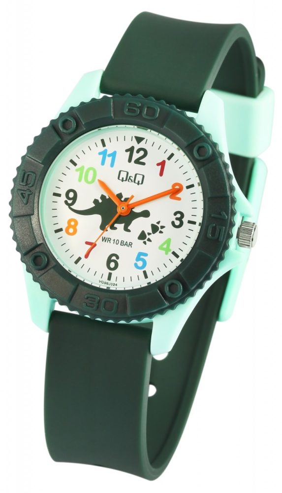 O relógio de pulso infantil analógico de 3 ponteiros da marca Q&Q possui um movimento de quartzo de alta qualidade. A pulseira de silicone verde escuro tem 16 mm de largura na alça e pode ser aberta e fechada com uma fivela de plástico verde claro. Graças ao material, o relógio não é apenas robusto, mas também garante conforto de uso. O comprimento total do relógio é de 24 cm. A caixa de plástico verde claro com vidro plástico tem um diâmetro de 35 mm e uma altura de caixa de 10 mm. O fundo da caixa é feito de aço inoxidável. O mostrador é branco e impresso com números coloridos, os três ponteiros são laranja. Além disso, o mostrador é decorado com um dinossauro e o relógio tem resistência à água de 10 ATM.