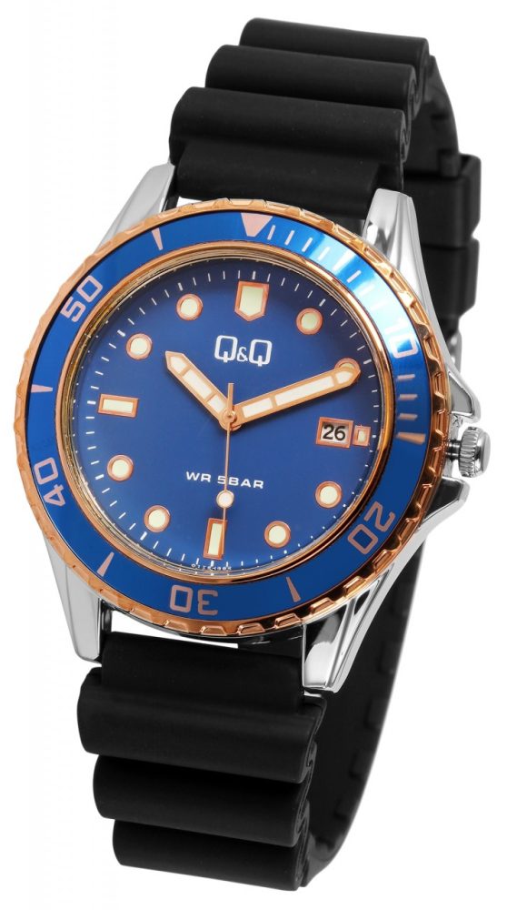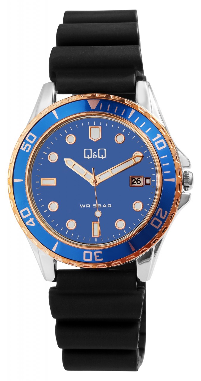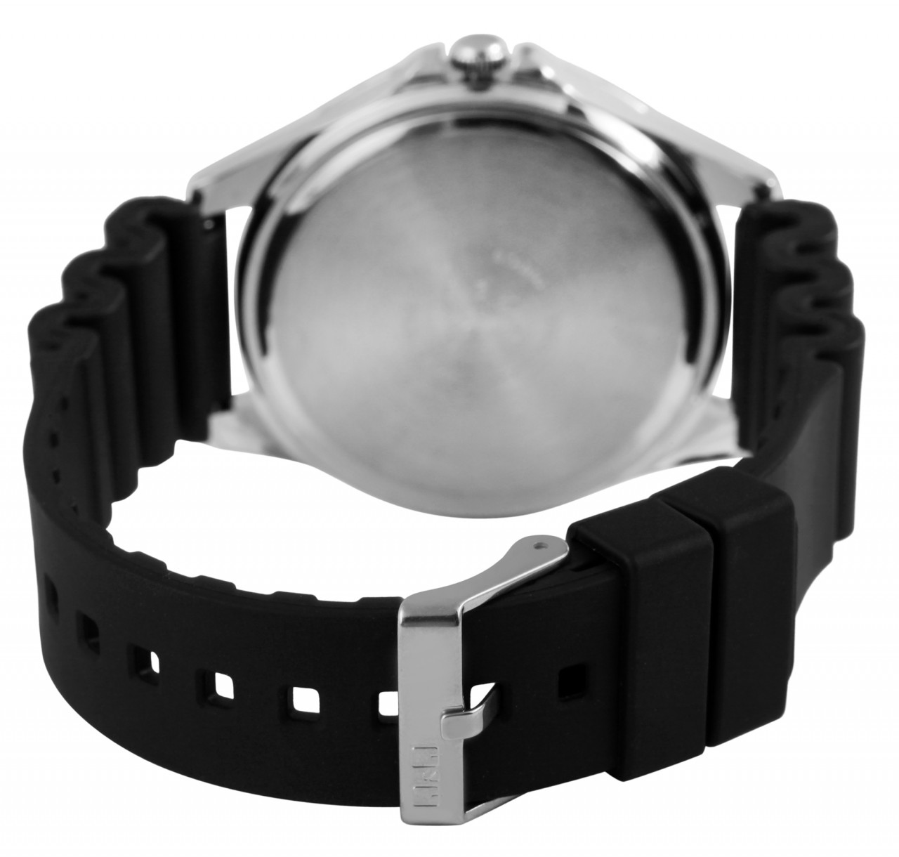 O relógio de pulso analógico masculino de 3 ponteiros da marca Q&Q possui um movimento de quartzo de alta qualidade. A pulseira de silicone preta tem 20 mm de largura na alça e pode ser aberta e fechada usando uma fivela prateada. O comprimento total do relógio é de 26 cm. A caixa de metal prateado com moldura em ouro azul/rosa e cristal mineral tem um diâmetro de 43 mm e uma altura de caixa de 11 mm. O fundo da caixa é feito de aço inoxidável e o relógio tem resistência à água de 5 ATM. Os ponteiros e índices revestidos com Superluminova facilitam a leitura das horas, mesmo no escuro.