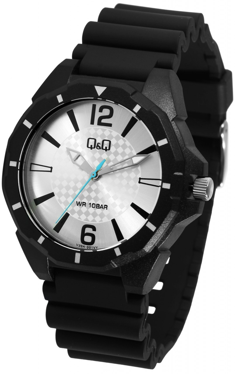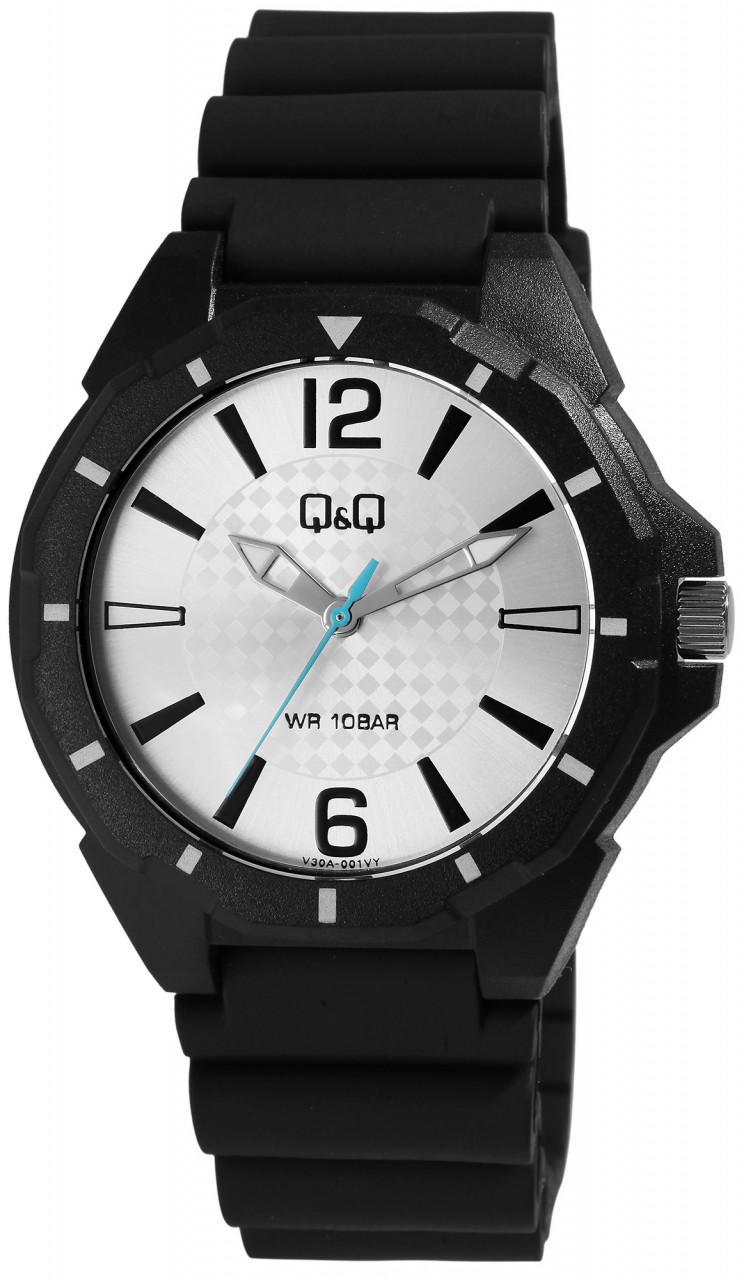O relógio de pulso analógico de 3 ponteiros para homem da marca Q&Q possui um movimento de quartzo preciso e de alta qualidade. A pulseira de silicone preta tem 17 mm de largura na alça e pode ser aberta e fechada com uma fivela de aço inoxidável prateada. O comprimento total do relógio é de 24,5 cm. A caixa de plástico preto com vidro mineral e moldura desportiva tem um diâmetro de 43 mm e uma altura de 12 mm. A parte traseira da caixa é feita de aço inoxidável e fixada à caixa com quatro parafusos de aço inoxidável. A hora pode ser facilmente lida graças ao mostrador claramente projetado com índices de linha. Além disso, o relógio é confortável de usar graças à pulseira de silicone macia.