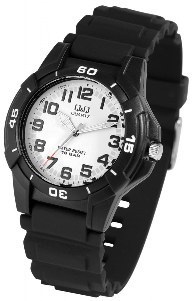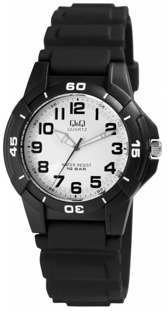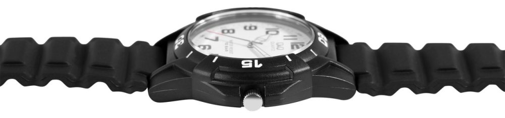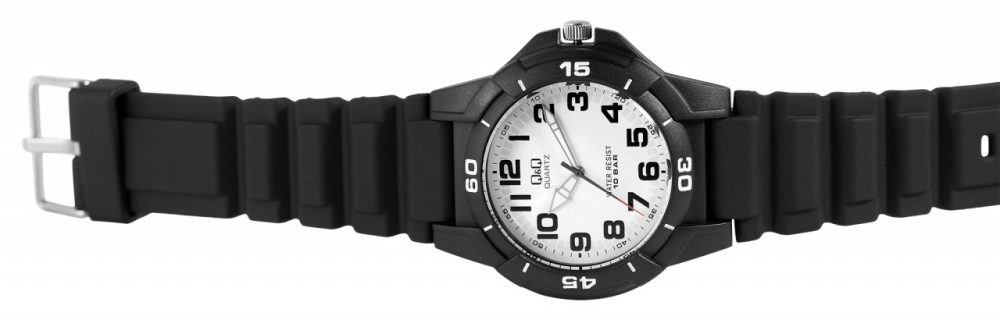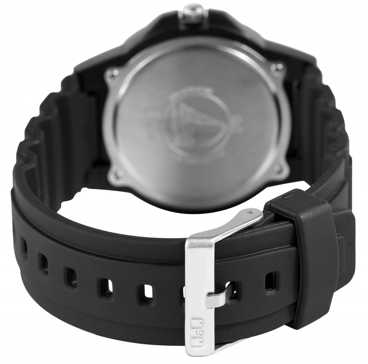O relógio analógico masculino de 3 ponteiros da marca Q&Q possui um movimento de quartzo preciso e de alta qualidade. A pulseira de silicone preta tem 16 mm de largura na alça e pode ser aberta e fechada com uma fivela de aço inoxidável prateada. O comprimento total do relógio é de 25 cm. A caixa de plástico preto com vidro mineral tem um diâmetro de 39 mm e uma altura de 10 mm. A parte traseira da caixa é feita de aço inoxidável e fixada à caixa com quatro parafusos de aço inoxidável. Além disso, o relógio é confortável de usar graças à pulseira de silicone macia e é particularmente fácil de limpar graças aos materiais de fácil manutenção. A resistência à água é de 10 ATM..