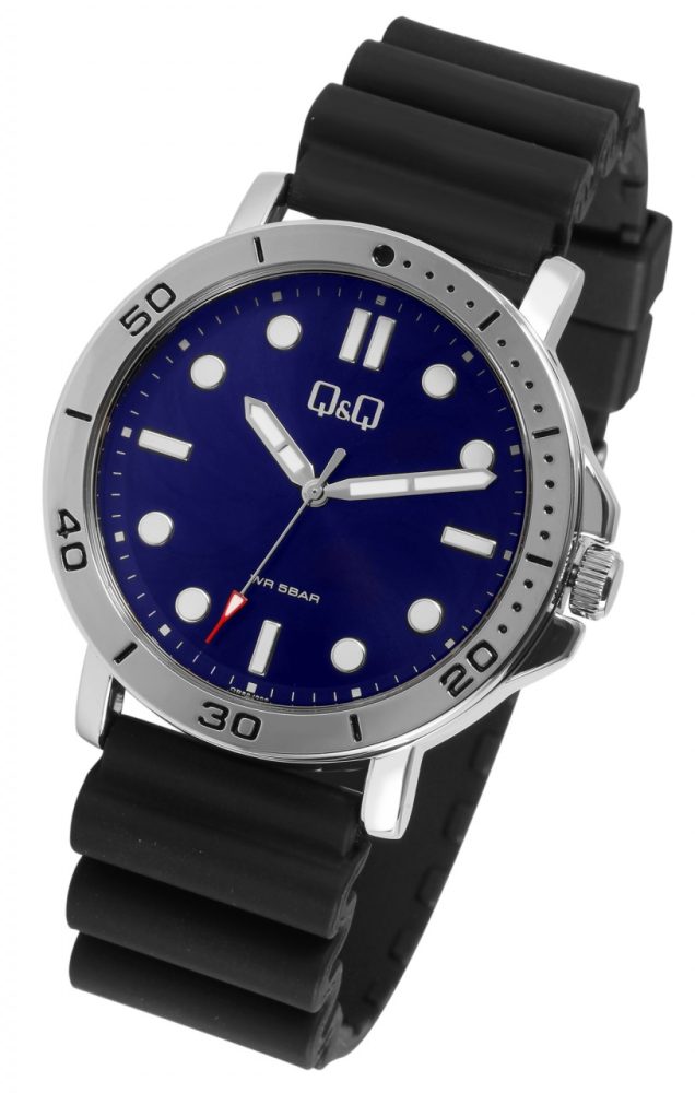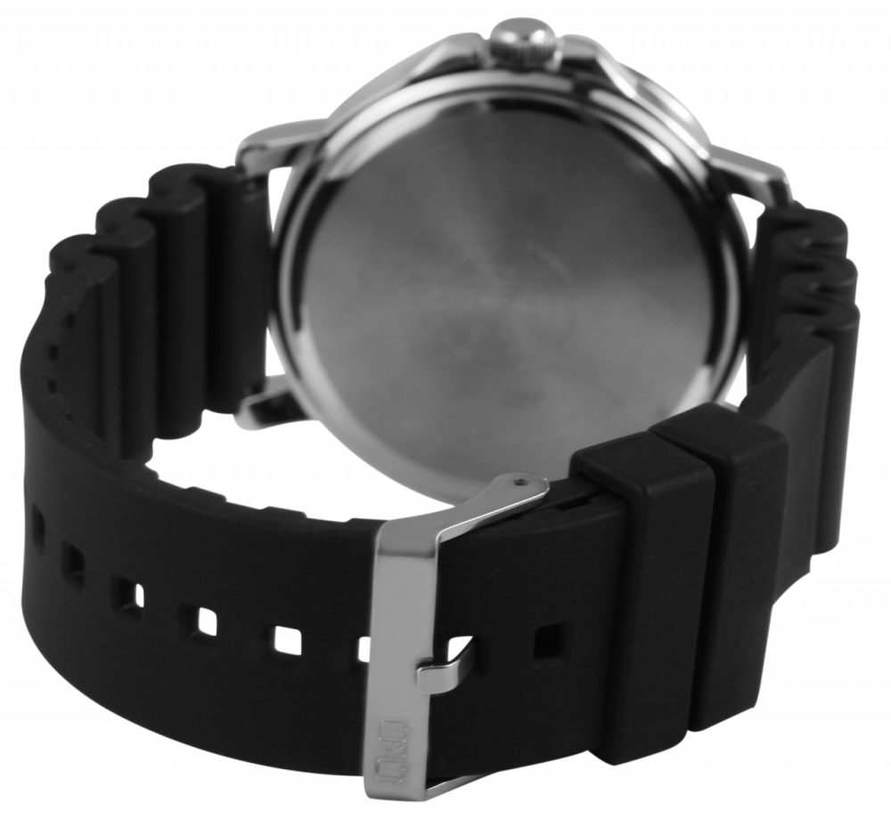O relógio de pulso analógico masculino de 3 ponteiros da marca Q&Q possui um movimento de quartzo de alta qualidade. A pulseira de silicone preta tem 22 mm de largura na alça e pode ser aberta e fechada usando uma fivela prateada. O comprimento total do relógio é de 26 cm. A caixa de metal prateado com vidro mineral tem um diâmetro de 44 mm e uma altura de 10,5 mm. O fundo da caixa é feito de aço inoxidável e o relógio tem resistência à água de 5 bar. Os ponteiros e índices revestidos com Superluminova facilitam a leitura das horas, mesmo no escuro. A pulseira de silicone e a moldura marcante garantem um visual esportivo e completam perfeitamente o design de sucesso do relógio.