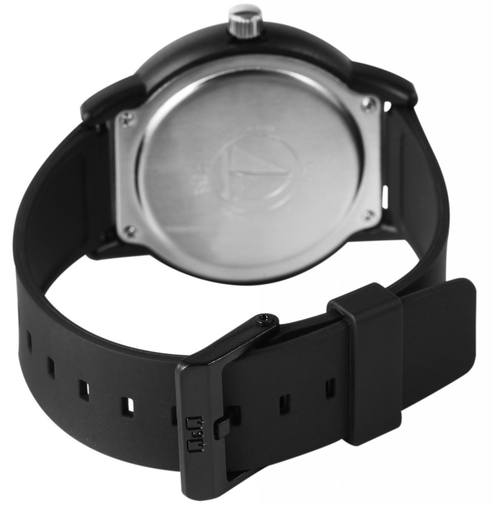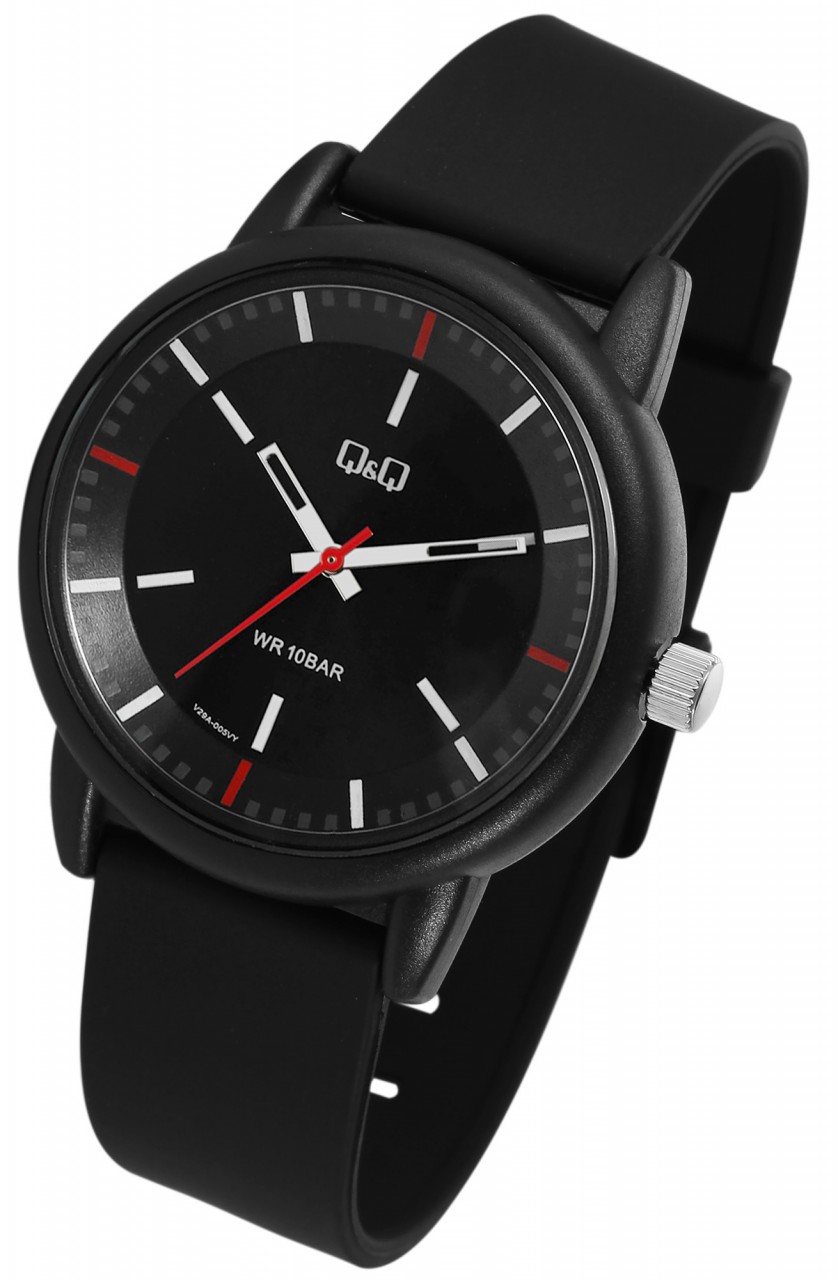 O relógio de pulso analógico de 3 ponteiros para homem da marca Q&Q possui um movimento de quartzo preciso e de alta qualidade. A pulseira de silicone preta tem 20 mm de largura na alça e pode ser aberta e fechada com uma fivela preta. O comprimento total do relógio é de 24,5 cm. A caixa de plástico preto com vidro mineral tem um diâmetro de 42 mm e uma altura de 11 mm. A parte traseira da caixa é feita de aço inoxidável e fixada à caixa com quatro parafusos de aço inoxidável. A hora pode ser facilmente lida graças ao mostrador preto com índices vermelhos/brancos.