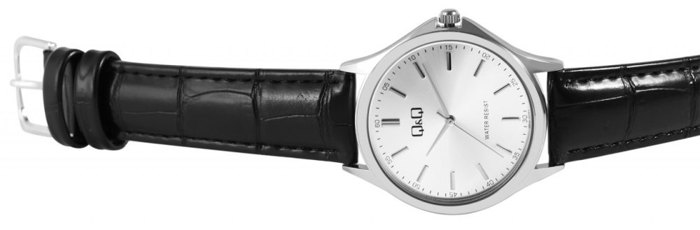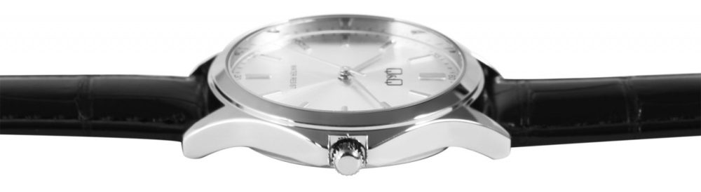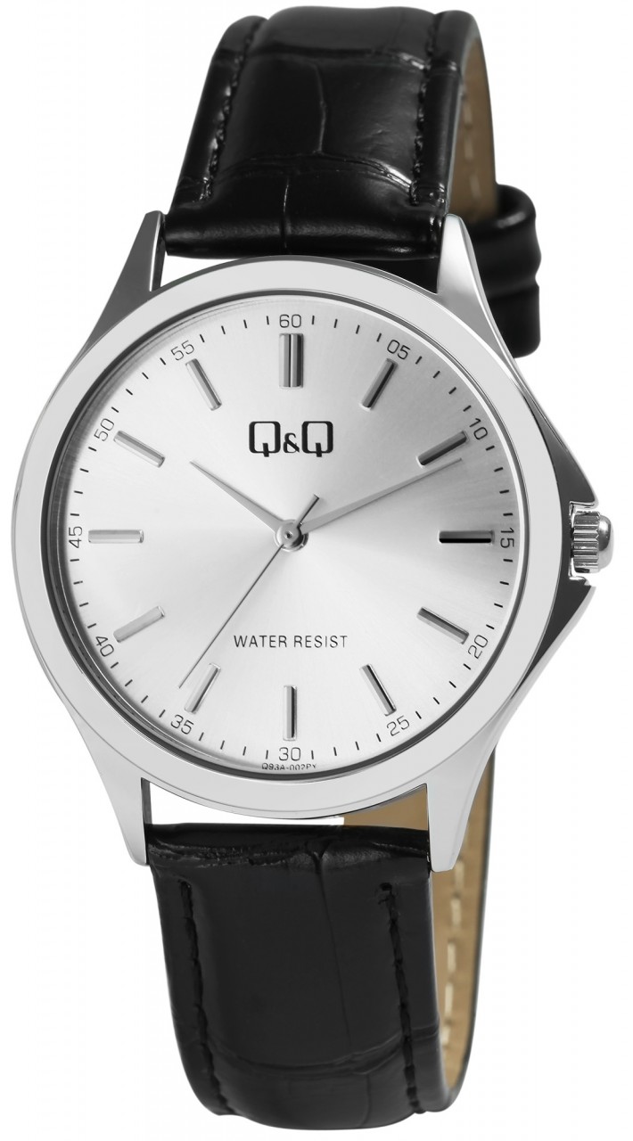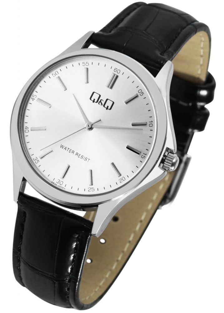 O relógio de pulso analógico de 3 ponteiros para homem da marca Q&Q possui um movimento de quartzo preciso e de alta qualidade. A pulseira em imitação de pele preta com relevo tem 18 mm de largura nas alças e pode ser aberta e fechada com uma fivela prateada. A pulseira acolchoada garante um ajuste confortável e cabe confortavelmente no seu pulso. O comprimento total do relógio é de 24 cm. A caixa de metal prateado com vidro mineral tem um diâmetro de 36 mm e uma altura de 8 mm. A hora pode ser lida facilmente graças ao mostrador organizado com índices de linha.