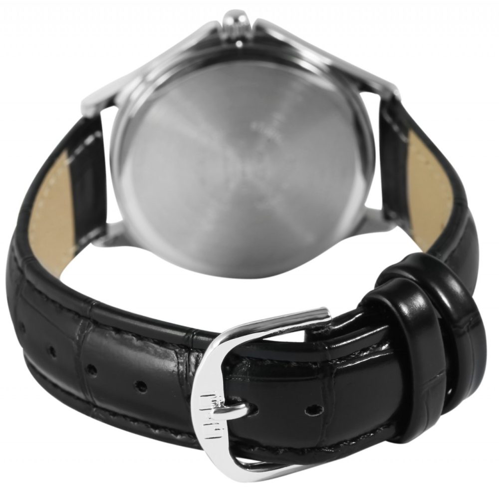 O relógio de pulso analógico de 3 ponteiros para homem da marca Q&Q possui um movimento de quartzo preciso e de alta qualidade. A pulseira em imitação de pele preta com relevo tem 18 mm de largura nas alças e pode ser aberta e fechada com uma fivela prateada. A pulseira acolchoada garante um ajuste confortável e cabe confortavelmente no seu pulso. O comprimento total do relógio é de 24 cm. A caixa de metal prateado com vidro mineral tem um diâmetro de 36 mm e uma altura de 8 mm. A hora pode ser lida facilmente graças ao mostrador organizado com índices de linha. O fundo da caixa também é feito de aço inoxidável e o relógio tem resistência à água de 3 ATM.