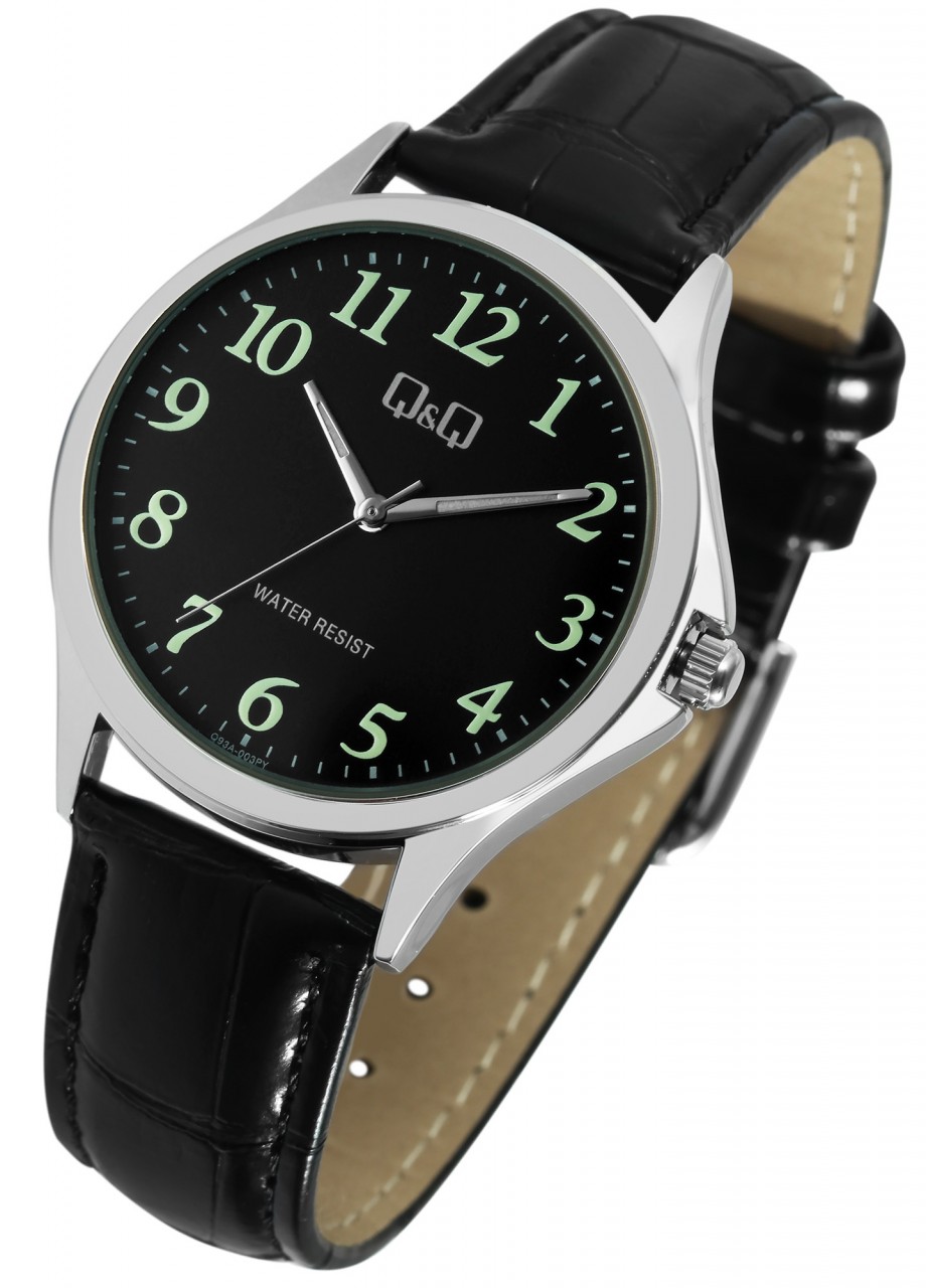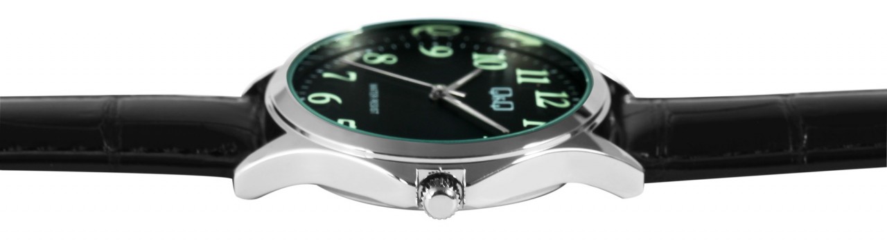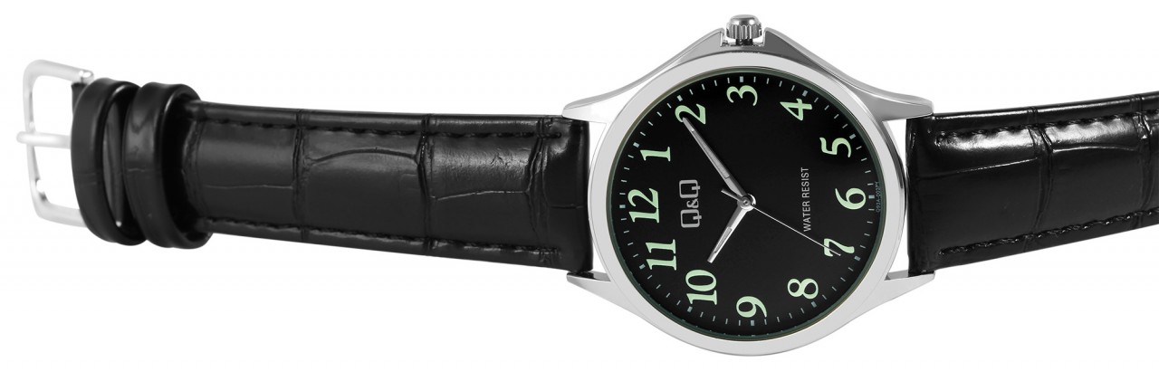 O relógio de pulso analógico de 3 ponteiros para homem da marca Q&Q possui um movimento de quartzo preciso e de alta qualidade. A pulseira em imitação de pele preta com relevo tem 18 mm de largura nas alças e pode ser aberta e fechada com uma fivela prateada. A pulseira acolchoada garante um ajuste confortável e cabe confortavelmente no seu pulso. O comprimento total do relógio é de 24 cm. A caixa de metal prateado com vidro mineral tem um diâmetro de 36 mm e uma altura de 8 mm. A hora pode ser facilmente lida graças ao mostrador preto com números e ponteiros revestidos de Superluminova. O fundo da caixa também é feito de aço inoxidável e o relógio tem resistência à água de 3 ATM.