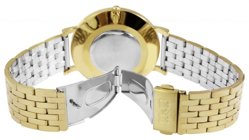 O relógio de pulso analógico masculino de 3 ponteiros da marca Q&Q possui um movimento de quartzo de alta qualidade. A pulseira em aço inoxidável dourado tem 18 mm de largura na alça e pode ser aberta e fechada com um fecho dobrável em aço inoxidável dourado. O comprimento total do relógio é de 22,5 cm. A caixa redonda de metal com vidro mineral tem um diâmetro de 40 mm e uma altura de 7,5 mm. O fundo da caixa é feito de aço inoxidável e o relógio tem resistência à água de 3 bar. O mostrador é claramente projetado. Os ponteiros e índices também são dourados e completam harmoniosamente a aparência geral do relógio masculino.