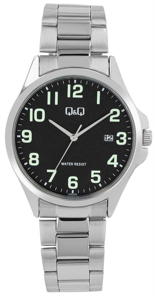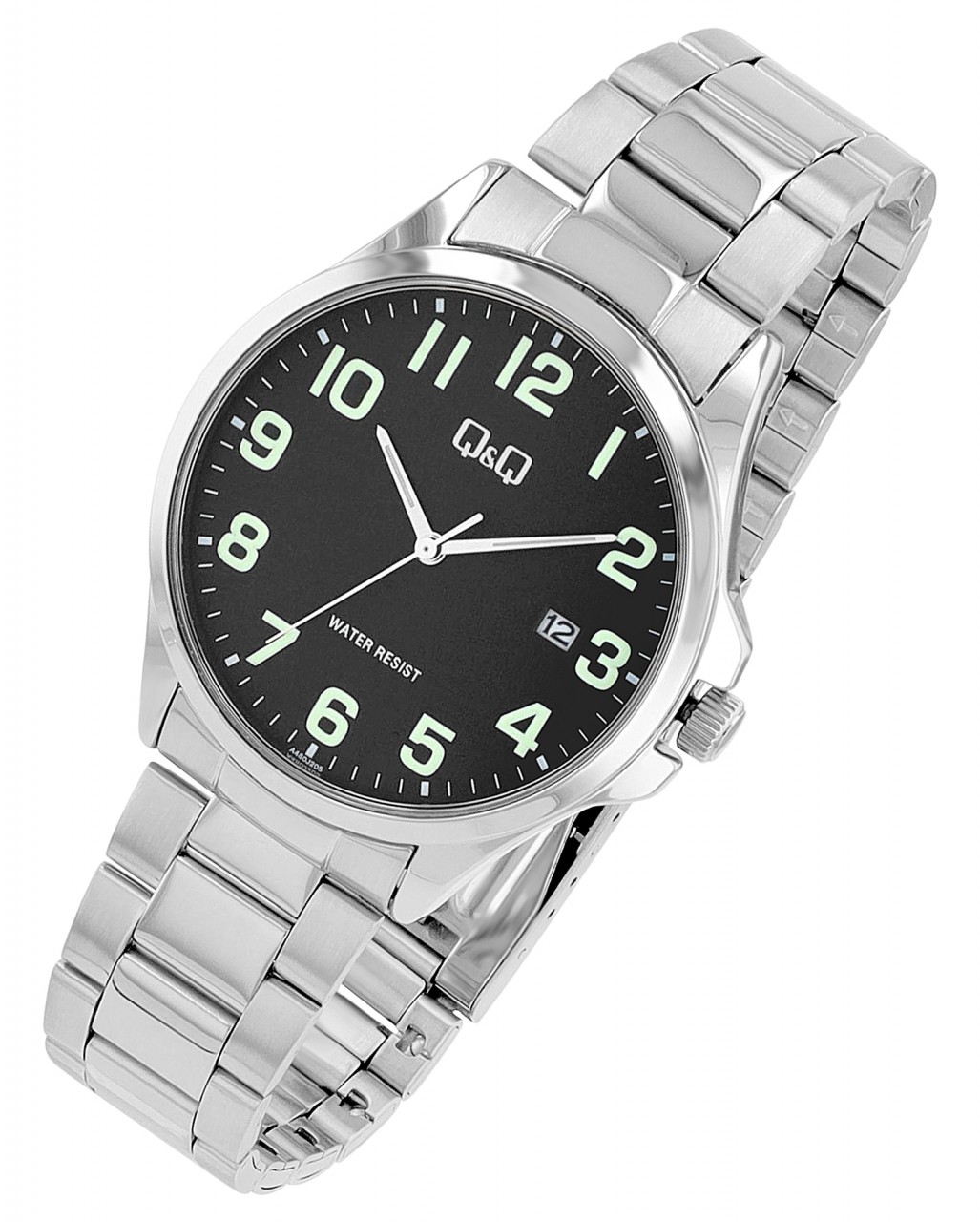 Com o relógio masculino Q&Q com pulseira de aço inoxidável, você tem a oportunidade de oferecer aos seus clientes um produto que combina qualidade e elegância. Você ficará surpreso com a versatilidade e o design atemporal deste relógio. O relógio masculino possui um movimento de quartzo de alta qualidade que depende de precisão e confiabilidade. Com um mostrador analógico e três ponteiros, não é apenas funcional, mas também elegante. O mostrador preto com algarismos arábicos e exibição da data às três horas conferem ao relógio uma aparência masculina atemporal. A pulseira prateada, o índice verde e a caixa prateada completam o design elegante.