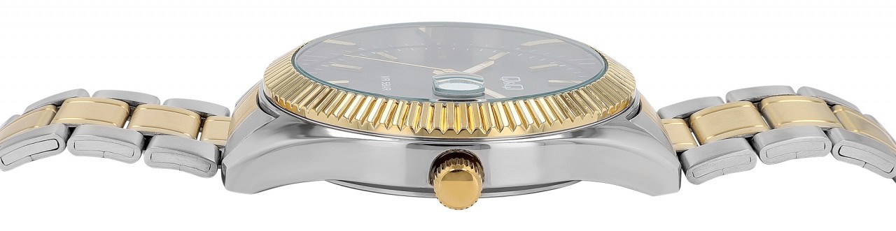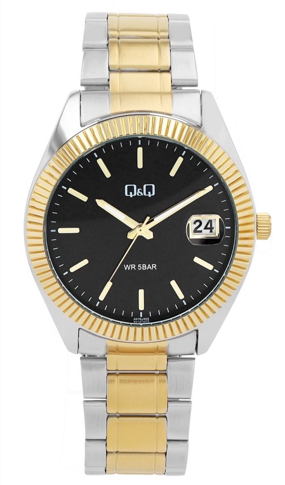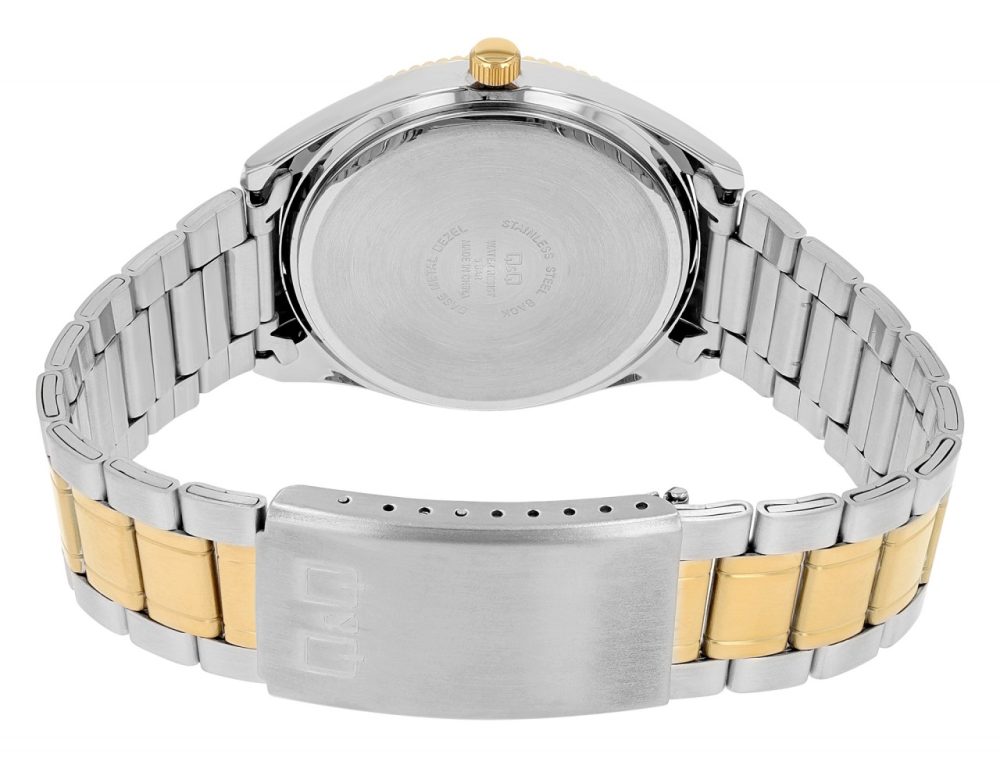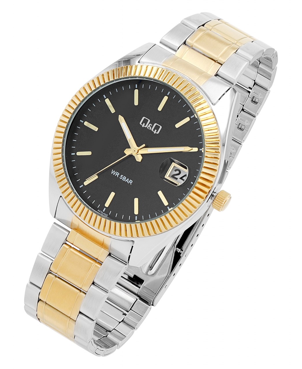 Relógio masculino Q&Q com pulseira de aço inoxidável, 5 barras, cores prata e ouro.