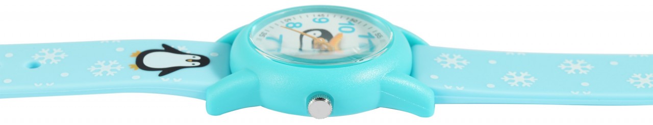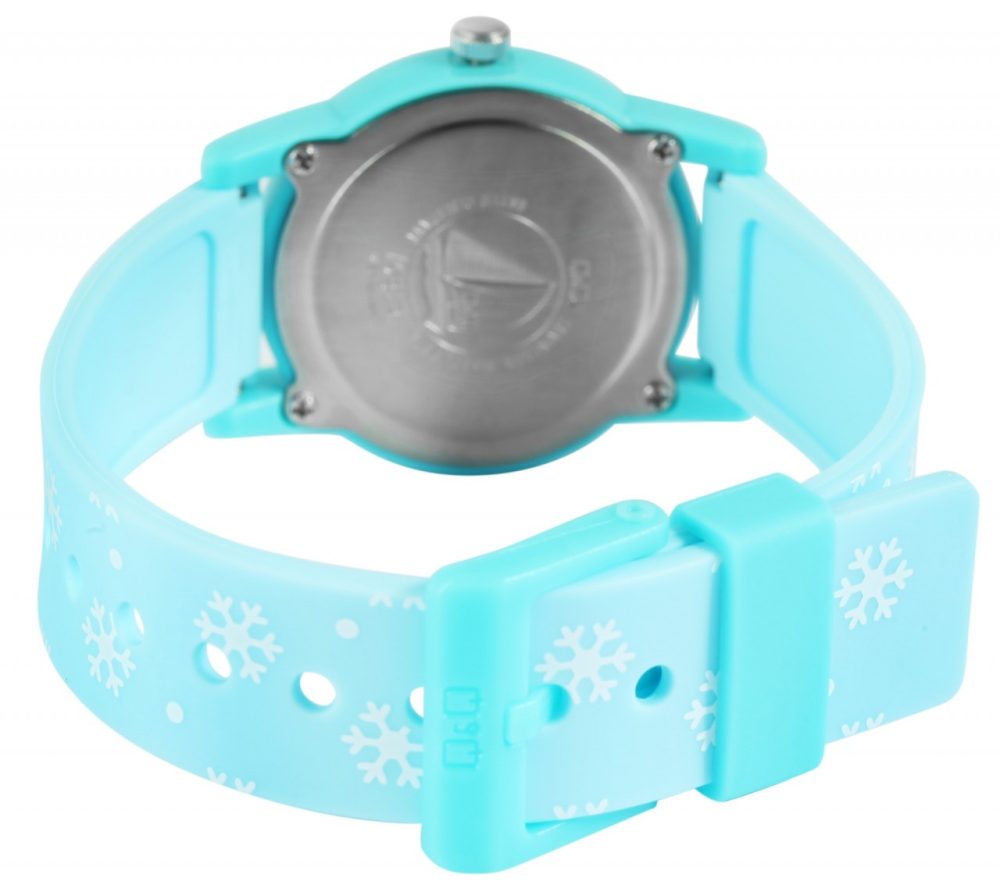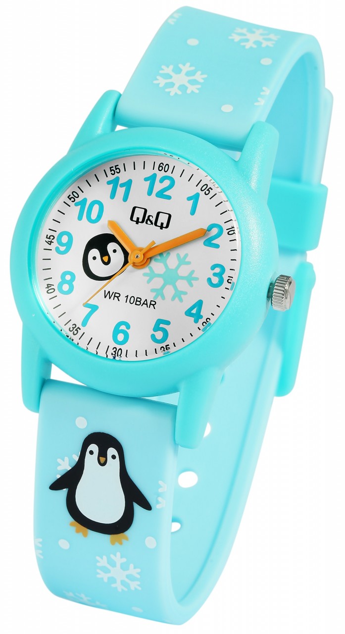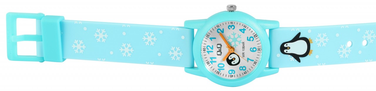 O relógio de pulso infantil analógico de 3 ponteiros da marca Q&Q possui um movimento de quartzo de alta qualidade. A pulseira de silicone azul claro tem 16 mm de largura na alça e pode ser aberta e fechada com uma fivela de plástico azul claro. O comprimento total do relógio é de 22,5 cm. A caixa de plástico azul com vidro plástico tem um diâmetro de 30 mm e uma altura de caixa de 10 mm. O fundo da caixa é feito de aço inoxidável. A pulseira de silicone é decorada com pinguins e flocos de neve e garante conforto de uso.