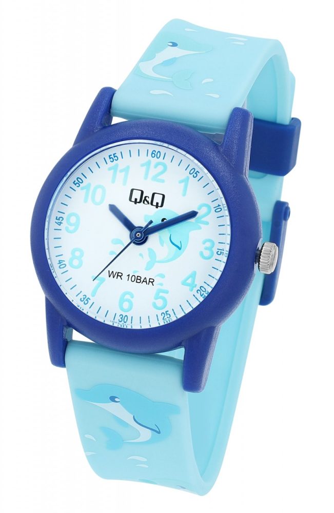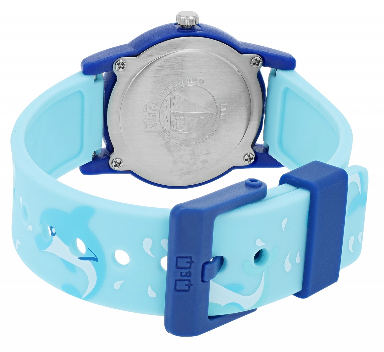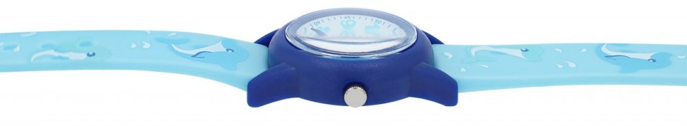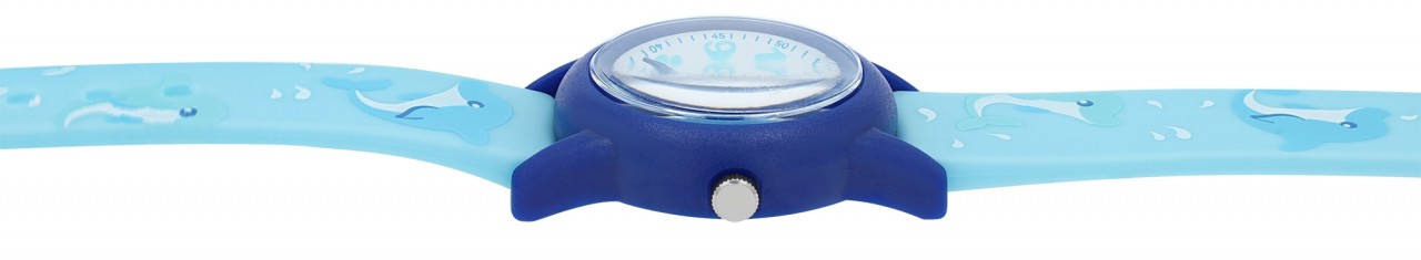 Este relógio analógico de 3 ponteiros chama a atenção. A pulseira do relógio é decorada com divertidos motivos de golfinhos. A combinação de cores harmoniosas de azul claro e escuro se encaixa perfeitamente no design marítimo e dá ao relógio uma aparência emocionante e adequada para crianças. O comprimento total do relógio é de 22,5 cm, o diâmetro da caixa é de 30 mm e a altura da caixa é de 10 mm. Com uma largura de pulseira de 16 mm, o relógio cabe confortavelmente no pulso da criança sem parecer muito volumoso.