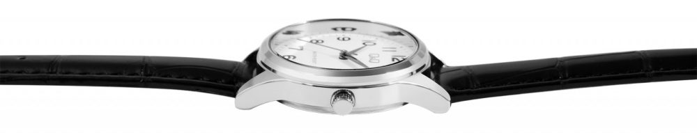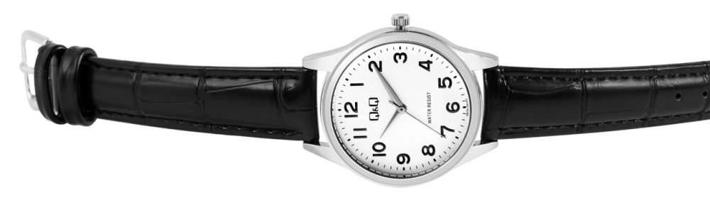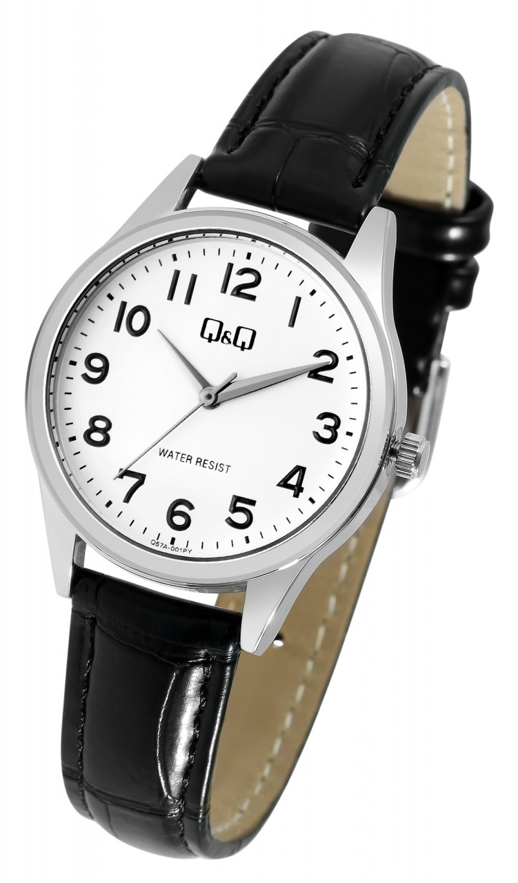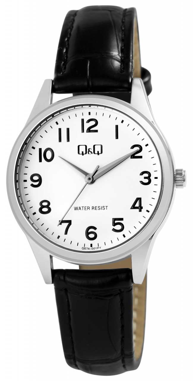 O relógio de pulso feminino analógico de 3 ponteiros da marca Q&Q possui um movimento de quartzo preciso e de alta qualidade da marca Miyota. A pulseira em imitação de pele preta com relevo tem 14 mm de largura nas alças e pode ser aberta e fechada com uma fivela prateada. A pulseira acolchoada garante um ajuste confortável e cabe confortavelmente no seu pulso. O comprimento total do relógio é de 22,5 cm. A caixa de metal prateado com vidro mineral tem um diâmetro de 30 mm e uma altura de 8 mm. A hora pode ser facilmente lida graças ao mostrador branco com algarismos pretos em estilo árabe. O fundo da caixa também é feito de aço inoxidável e o relógio tem resistência à água de 3 bar.