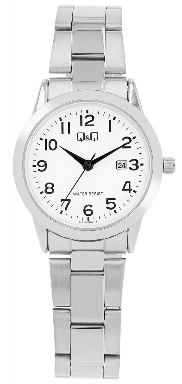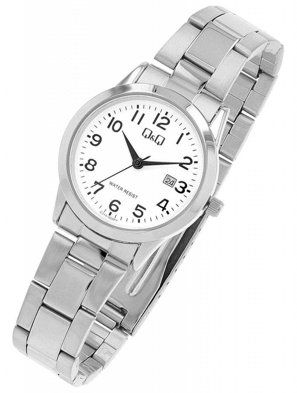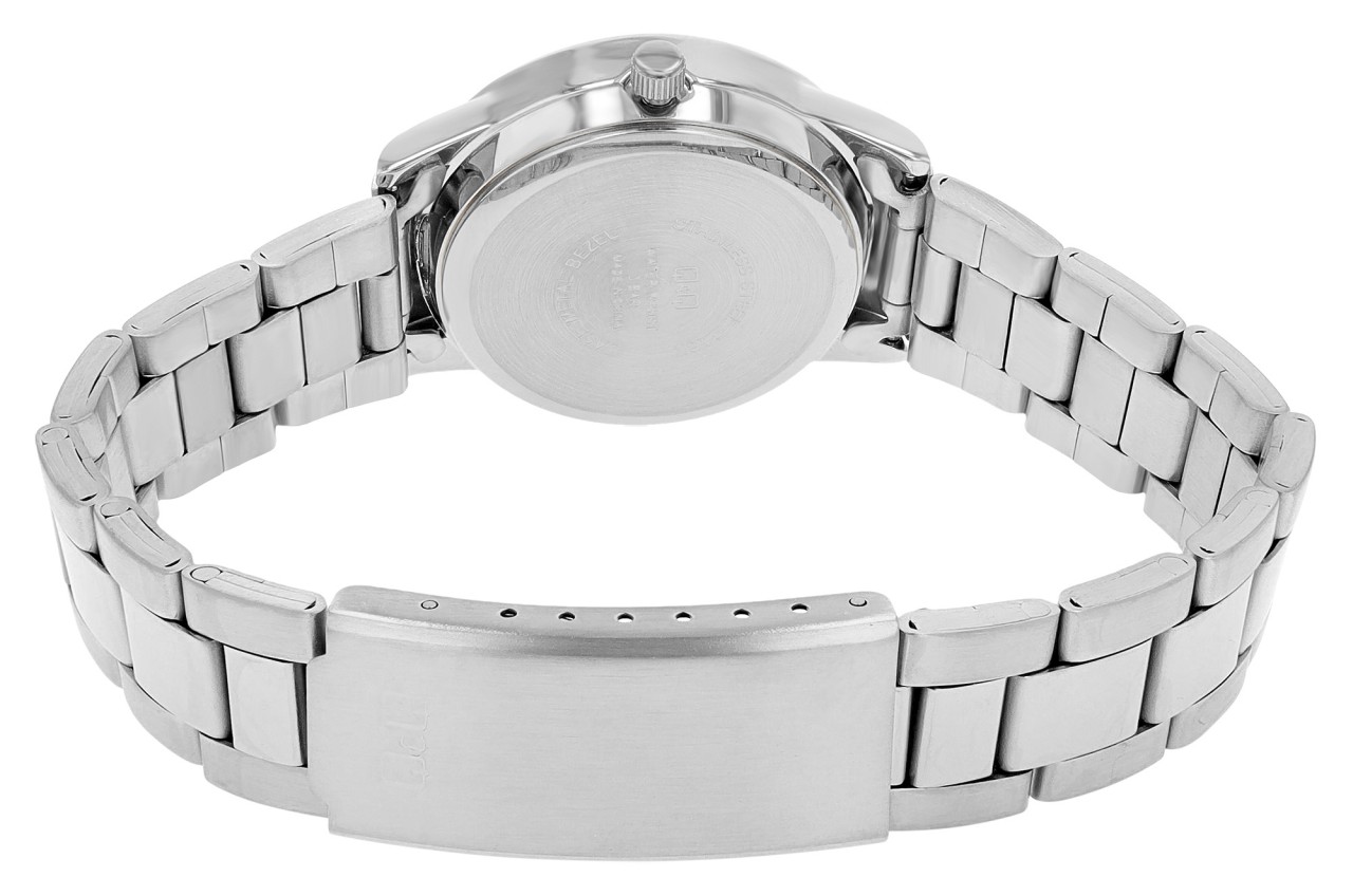 Relógio feminino Q&Q com pulseira em aço inoxidável e display de data. Este relógio de pulso feminino é movido por um movimento de quartzo de primeira classe que se caracteriza por uma confiabilidade excepcional. A pulseira de aço inoxidável prateado não é apenas elegante, mas também extremamente durável.