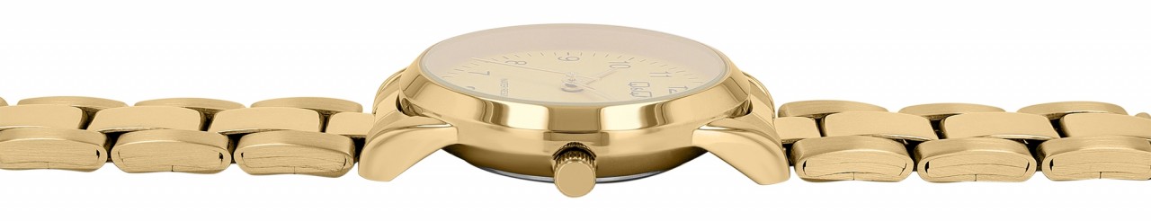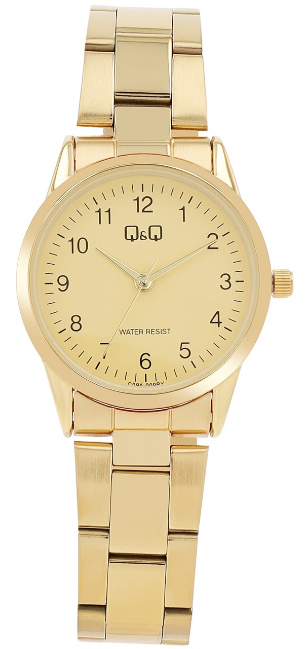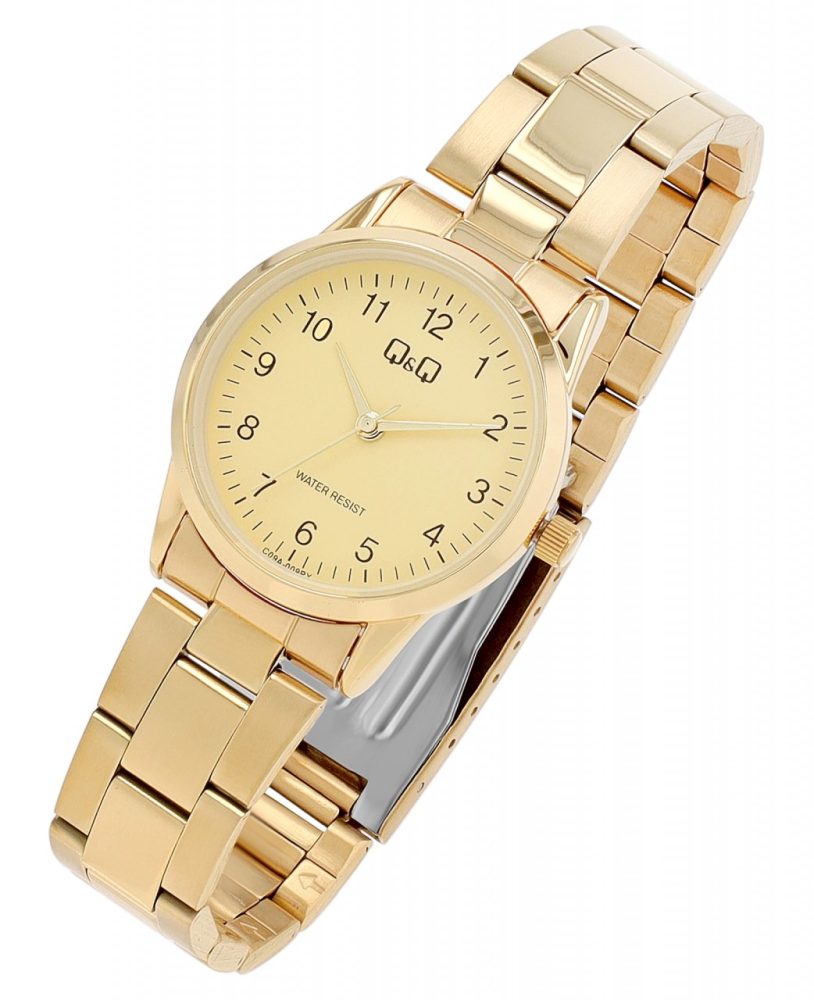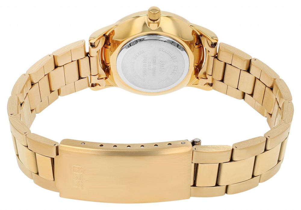 Deixe-se surpreender pela qualidade e charme deste relógio feminino Q&Q de aspecto clássico! Com movimento de quartzo de alta qualidade, oferece confiabilidade e precisão. A pulseira de aço inoxidável em tom dourado não é apenas uma afirmação elegante, mas também extremamente durável. A capacidade de encurtar a pulseira significa que este relógio pode ser perfeitamente adaptado a qualquer pulso. A caixa metálica oferece ao relógio uma estrutura robusta, enquanto o vidro mineral protege o mostrador.