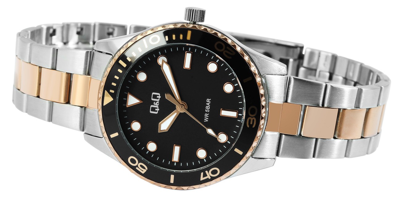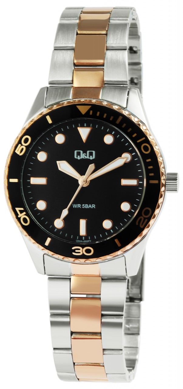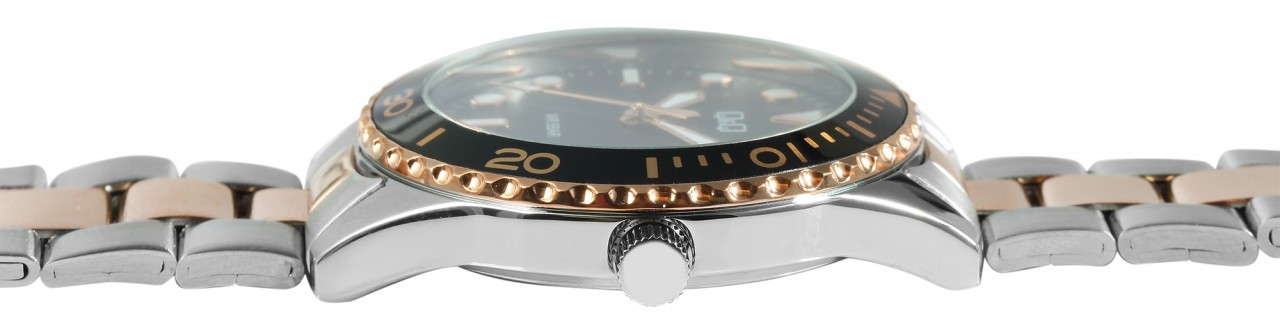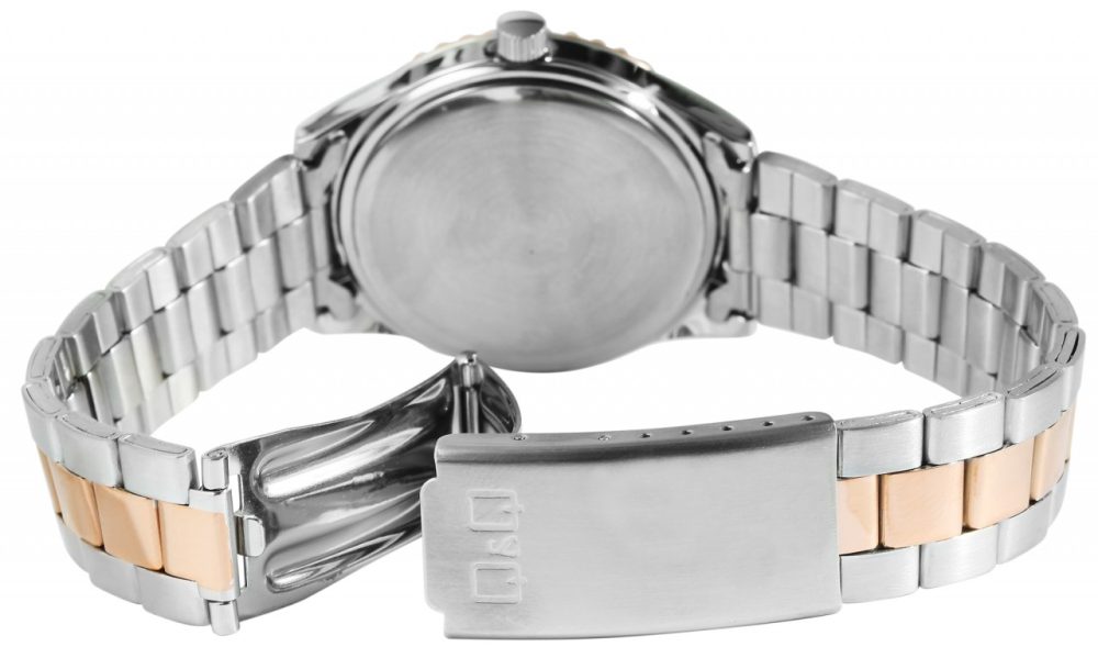 O relógio de pulso feminino analógico de 3 ponteiros da marca Q&Q possui um movimento de quartzo preciso e de alta qualidade da marca Miyota. A pulseira bicolor em aço inoxidável tem 18 mm de largura nas alças e pode ser aberta e fechada usando um fecho dobrável em aço inoxidável. A pulseira do relógio é particularmente robusta e durável e pode ser encurtada conforme desejado usando uma ferramenta adequada, graças aos elementos removíveis. O comprimento total do relógio é de 22 cm. A caixa de metal prateado com moldura em preto/ouro rosa e cristal mineral tem um diâmetro de 36 mm e uma altura de caixa de 9 mm.
