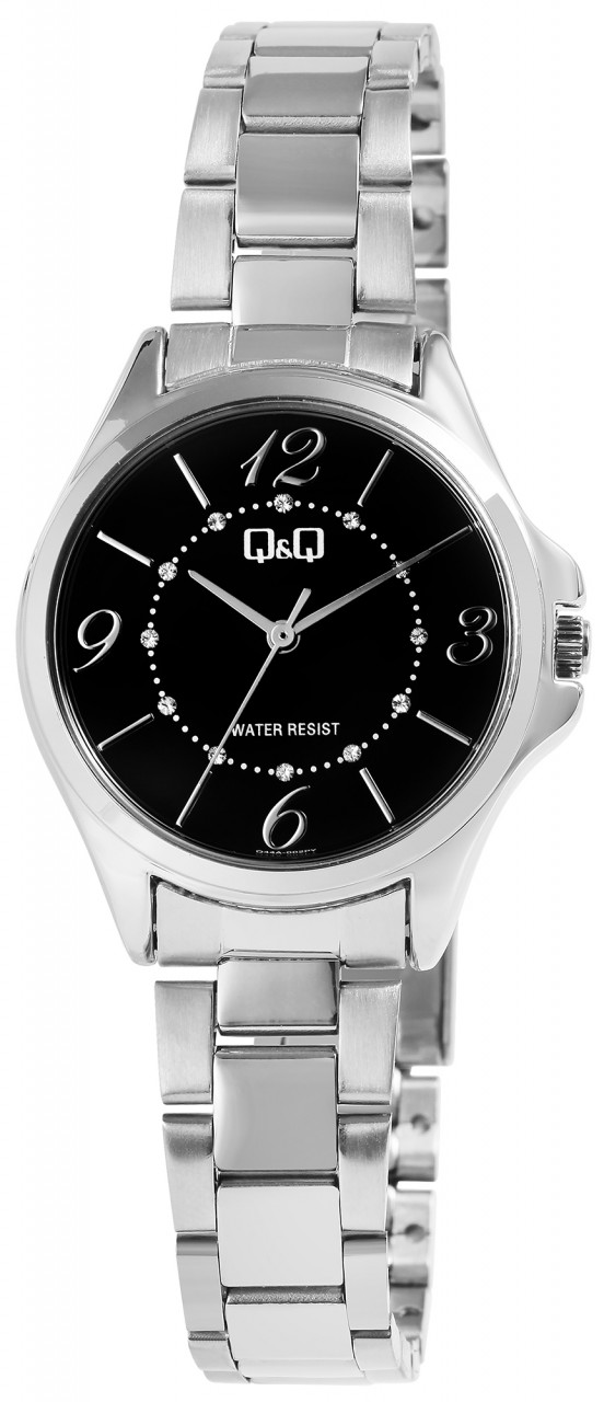 O relógio de pulso feminino analógico de 3 ponteiros da marca Q&Q possui um movimento de quartzo preciso e de alta qualidade da marca Miyota. A pulseira em aço inoxidável prateado tem 14 mm de largura nas alças e pode ser aberta e fechada usando um fecho dobrável em aço inoxidável. A pulseira do relógio é particularmente robusta e durável e pode ser encurtada conforme desejado usando uma ferramenta adequada, graças aos elementos removíveis. O comprimento total do relógio é de 20,5 cm. A caixa de metal prateado com vidro mineral tem um diâmetro de 30 mm e uma altura de 7,5 mm.