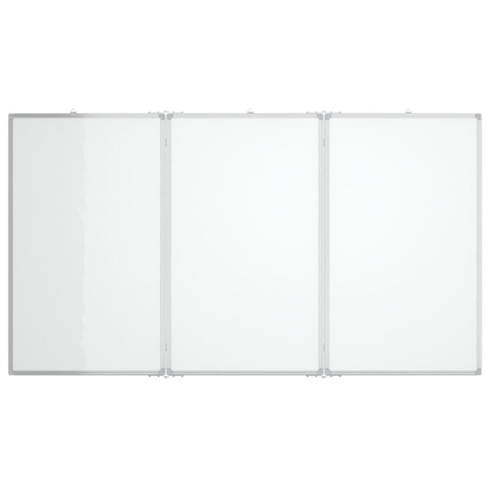 Este quadro branco magnético dobrável é uma solução ideal para criar um local em sua casa ou escritório onde possa escrever notas, rabiscar ou expor fotografias. Superfície lisa: o quadro branco magnético possui uma superfície lisa e lacada que é fácil de escrever e limpar. Além disso, pode anexar ficheiros, fotografias e outros elementos com imanes.Fácil de instalar: o quadro branco magnético é fornecido com 3 ganchos móveis que poderá ajustar às suas necessidades e assim instalá-lo rapidamente em qualquer parede desejada.Dobrável: o quadro branco magnético compreende dois painéis articulados que fornecem mais espaço de escrita e podem ser inclinados e dobrados de acordo com as suas necessidades.Segurança: o quadro branco magnético apresenta uma estrutura de alumínio resistente e um painel traseiro de metal, completo com capas protetoras nos quatro cantos para garantir a segurança do utilizador.Múltiplas aplicações: o quadro branco magnético pode ser utilizado como uma ferramenta versátil para apresentações e memorandos. É adequado para escolas, salas de conferências, escritórios e residências.