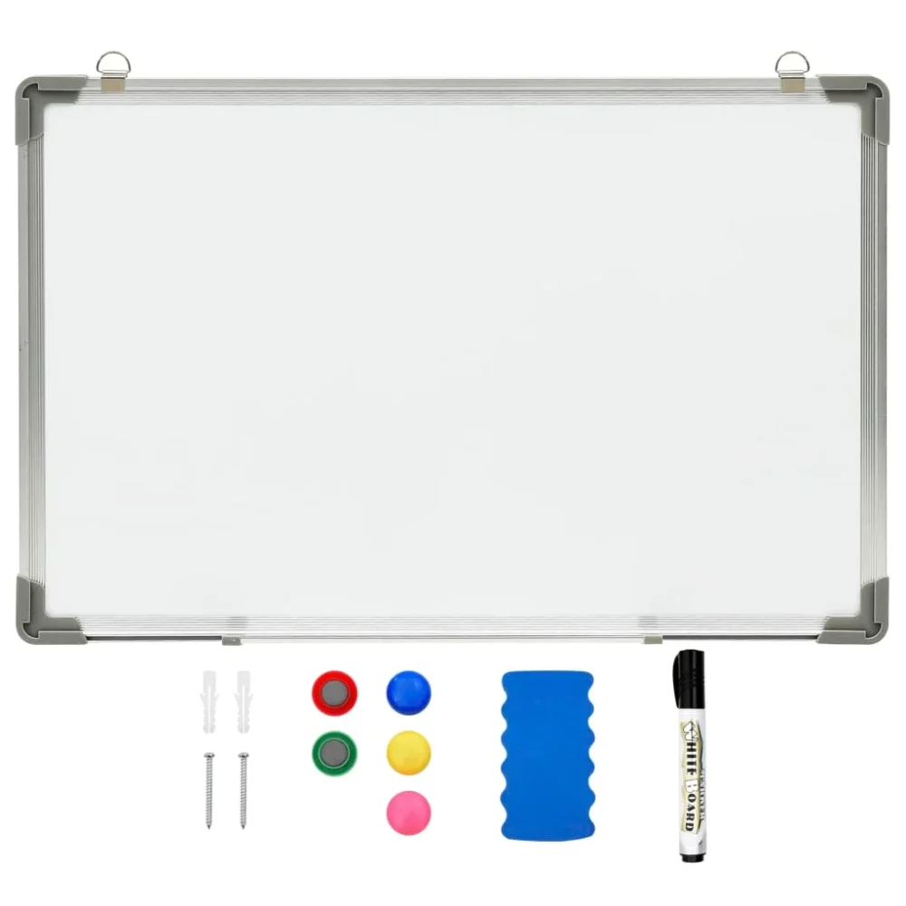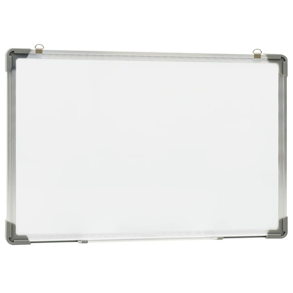 O quadro branco possui uma superfície de aço esmaltada que lhe permite escrever e limpar com facilidade, utilizando o marcador e o apagador incluídos. A estrutura de alumínio e os protetores de cantos tornam-no robusto e durável. Pode pendurar o artigo com os ímanes fornecidos. Estão incluídos ganchos e parafusos para facilitar a montagem na parede.