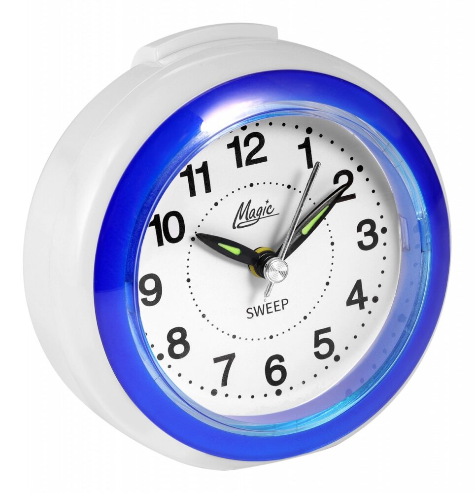 O despertador de quartzo da Magic impressiona pelo seu design redondo e atemporal. Com as suas dimensões compactas de 9 x 9 x 4,7 cm, este despertador é o acessório perfeito para a mesa de cabeceira. O som silencioso do despertador garante uma noite de sono tranquila. A função de luz integrada facilita a leitura da hora, mesmo no escuro. A prateleira superior oferece uma maneira conveniente de desativar o alarme de forma rápida e fácil. Os três ponteiros claramente visíveis e o mostrador de fácil leitura com algarismos arábicos permitem que você veja as horas rapidamente. No geral, este despertador é prático e fácil de usar.